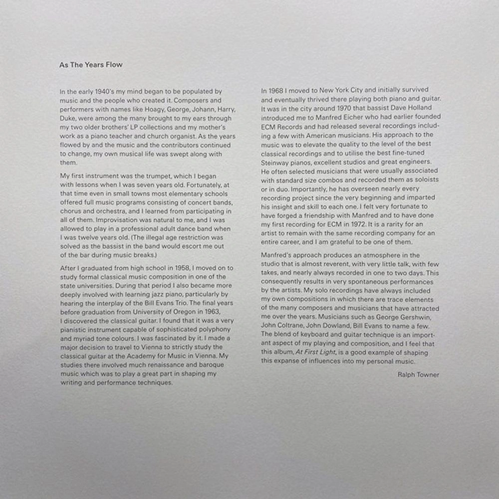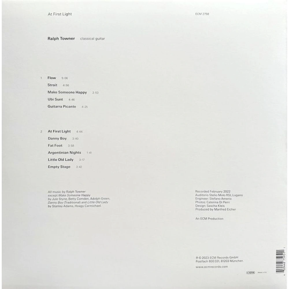 Американский гитарист Ральф Таунер, исполнитель ECM на протяжении всей своей музыкальной карьеры, создал уникальный коллектив своих записей для лейбла. Центральное место в его творчестве занимают сольные альбомы, первый из которых, «Дневник», вышел 50 лет назад. At First Light продолжает эту великую традицию, черпая вдохновение из широкой музыкальной палитры. «Мои сольные записи всегда включали мои собственные композиции, в которых есть следы многих композиторов и музыкантов, которые привлекали меня», — пишет Таунер в аннотации, ссылаясь, среди прочего, на влияние Джорджа Гершвина, Джона Колтрейна, Джона Дауленд и Билл Эванс: «Я считаю, что At First Light — хороший пример формирования этого разнообразия влияний в моей личной музыке». Помимо своих собственных пьес, Таунер также играет «Little Old Lady» Хоги Кармайкла, «Make Something Happy» Джула Стайна и традиционную мелодию «Danny Boy».