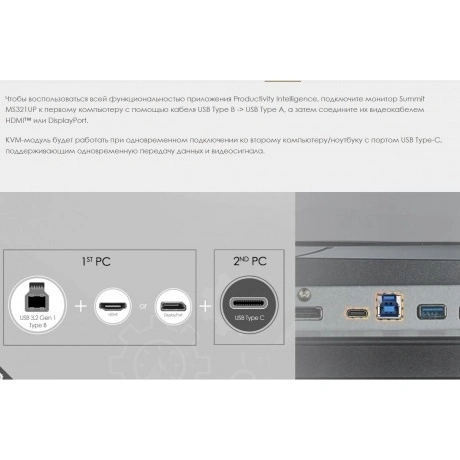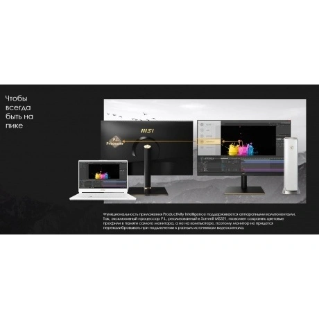 Монитор MSI Summit MS321UP с 32-дюймовым экраном IPS UltraHD предназначен для работы с графикой и творческими программами. Точность цветопередачи обеспечивается благодаря фабричной калибровке, цветовому охвату 136% sRGB и 95% DCI-P3, технологии DisplayHDR. Матовое покрытие и технологии защиты зрению уменьшают негативное воздействие на глаза. Монитор MSI Summit MS321UP выполнен в матовом черном корпусе с золотистыми акцентами. Функция KVM и программа Productivity Intelligence предусматривают переключение между разными компьютерами с помощью одного комплекта периферийных устройств. Мультиоконные режимы PIP и PBP Mode ускоряют работу в многозадачном режиме. Интерфейс USB Type-C служит для передачи видеосигнала и подзарядки мобильных устройств. Коммуникационные возможности дополнены разъемами DisplayPort и HDMI, портами USB Type-A. Поворотная подставка, перевод в портретный режим, регулировка угла наклона и высоты обеспечивают гибкость настройки положения экрана.