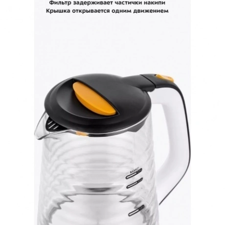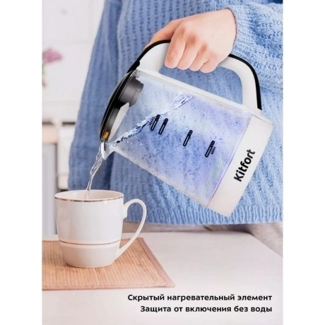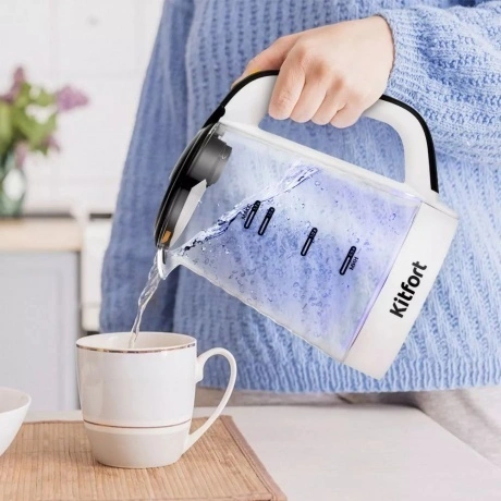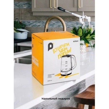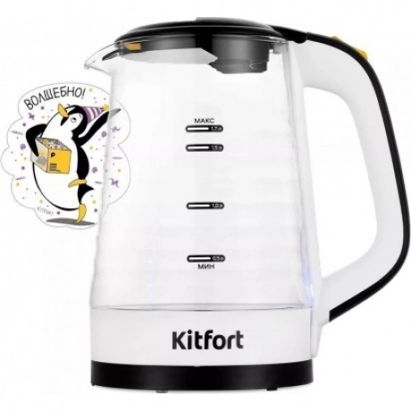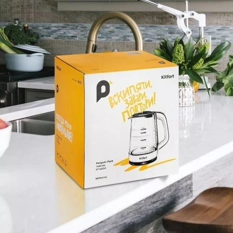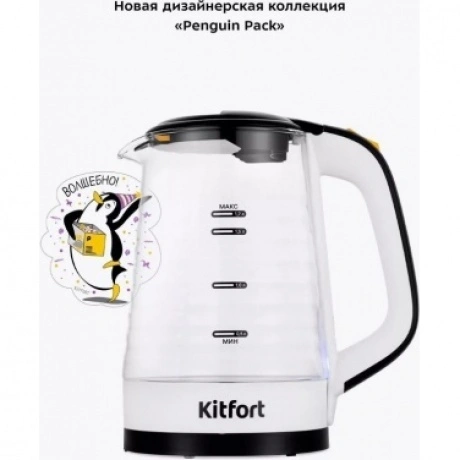 Электрический чайник Kitfort KT-6634 предназначен для быстрого кипячения воды дома, в офисе или на даче. Благодаря яркому цвету ручки и матовому стеклу с цветным градиентом он станет стильным акцентом на вашей кухне! Чайник за раз может вскипятить до 1.7 л воды. Ручка пластиковая, с внутренней стороны имеет приятную шершавую поверхность. Она не нагревается и удобно лежит в руке. Нагревательный элемент закрыт пластиной. Это снижает шум при кипячении и упрощает уход. При включении чайника синяя подсветка по периметру дна сигнализирует о его рабочем состоянии, а также красиво подсвечивает корпус прибора и воду. Мерная шкала для удобства располагается на внешней стороне чайника. После нажатия на переключатель загорится подсветка, и прибор начнёт нагреваться. Помимо этого, прибор обладает защитой от перегрева и предотвращает включение без воды. В носике KT-6634 имеется фильтр, который улавливает частицы накипи и предотвращает их попадание в чашку. На крышке установлена кнопка для простого открытия крышки. Большое горлышко чайника облегчает доступ внутрь при мытье и во время добавления воды. Благодаря специальной конструкции чайник автоматически выключается при закипании независимо от альтитуды. На нижней части подставки чайника имеется отсек для хранения шнура, в который можно смотать излишки шнура электропитания, чтобы он не мешал на столе. КТ-6634 выполнен в дизайне коллекции «Penguin Pack», который отражает энергию и яркость нового маскота – пингвина по имени Питер. В комплекте с прибором вы найдёте креативный магнит с этим персонажем. Соберите всю коллекцию китов и пингвинов! Помимо стильного внешнего исполнения и коллекционного магнита в комплекте, прибор упакован в фирменную коробку в дизайне коллекции «Penguin Pack».
