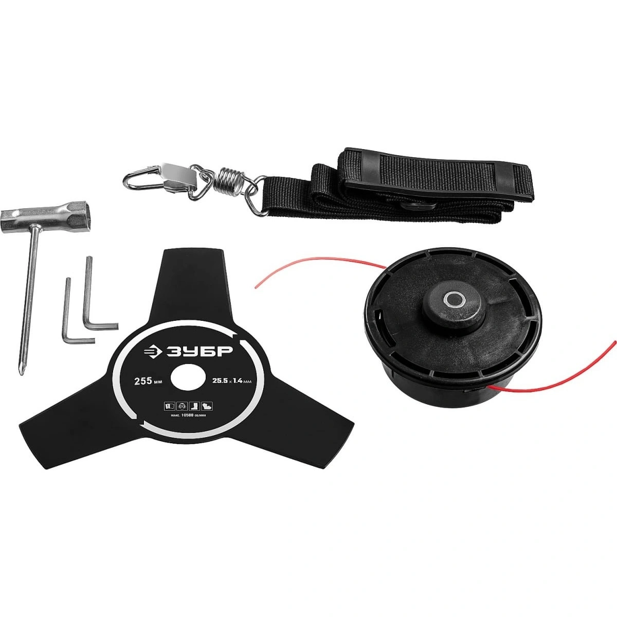 триммер, плечевой ремень, защитный кожух, дополнительная рукоятка, набор крепежа, ключ, нож, катушка с леской, инструкции по безопасности 1 экз., руководство по эксплуатации 1 экз., упаковка