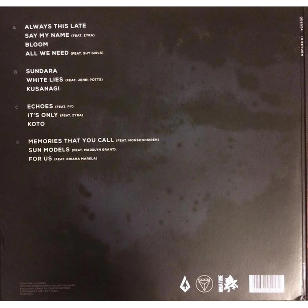 "In Return" - второй альбом американского электронного музыкального дуэта Odesza, выпущенный в 2014 году. Это дебют электронного дуэта на мейджор-лейбле после выпуска их самостоятельно выпущенного дебютного альбома Summer's Gone двумя годами ранее, который следует за ним. Альбом дебютировал на вершине рейтинга танцевальных/электронных альбомов Billboard. Трек "Say My Name" (инструментальная версия) используется в рекламном и розничном демонстрационном видео Windows 10. Издание на 180-граммовом двойном чёрном виниле включает код для скачивания альбома. Odesza - американский дуэт электронной музыки, родом из Беллингема, штат Вашингтон В его состав входят Харрисон Миллс и Клейтон Найт, известные по отдельности как Catacombkid и BeachesBeaches. Они объединились в 2012 году, когда Миллс и Найт окончили один и тот же вуз - Университет Западного Вашингтона. Их дебютный альбом "Summer's Gone" (2012) получил признание в сообществе андеграундной электронной музыки. После своего дебютного мини-альбома "My Friends Never Die" (2013) они выпустили свой второй полноформатный альбом "In Return" (2014). Композиция "Say My Name" ( микс RAC) принесла дуэту первую номинацию на Грэмми как "лучшая неклассическая запись ремикса". "A Moment Apart" (2017), их третий студийный альбом, достиг третьего места в американском чарте Billboard 200 и возглавил рейтинг лучших электронных/танцевальных альбомов. Он был номинирован на "лучший танцевальный/электронный альбом", а трек "Line of Sight" также был номинирован на лучшую танцевальную запись на 60-й ежегодной премии Грэмми в 2018 году. За свой четвертый студийный альбом "The Last Goodbye" (2022) Odesza были номинированы премию Грэмми в категории "лучший танцевальный/электронный альбом". Дуэт также был номинирован в 2017 году на премию Electronic Music Awards в категории "Продюсер года". Они основали и управляют собственным звукозаписывающим лейблом Foreign Family Collective, который распространяет песни, а также визуальное искусство артистов. Кроме того, Billboard поставил Odesza на 10-е место в рейтинге танцевальных музыкантов Billboard Dance 100 за 2018 год.