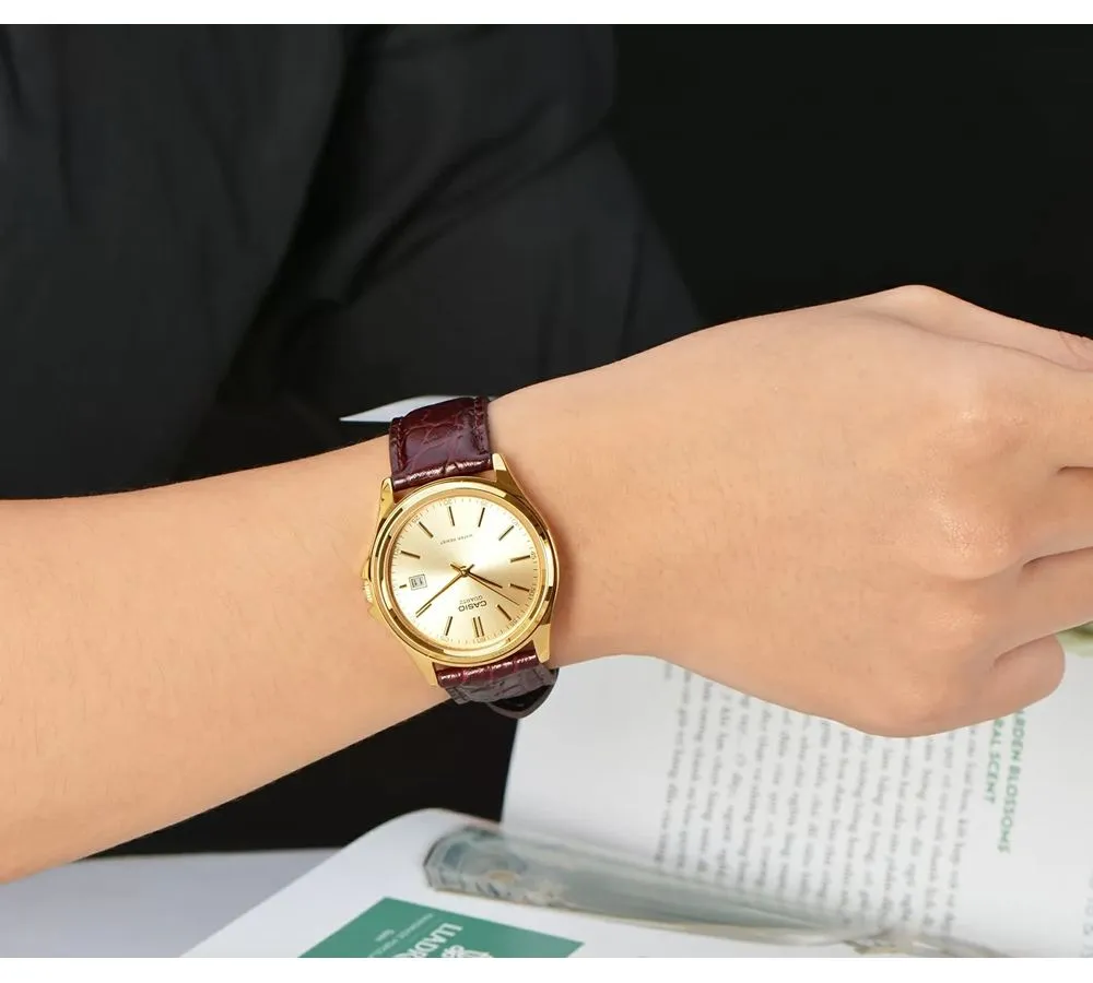 Практичные мужские наручные часы Casio с круглым корпусом и кожаным ремешком. На черном циферблате присутствует окошко даты. Заводная головка с защитой. Ремешок с классической застежкой.