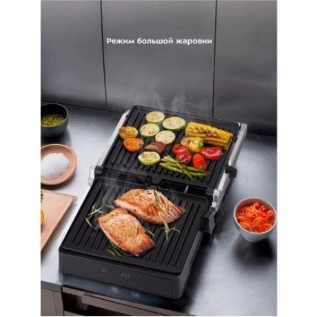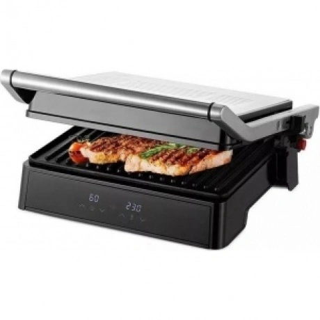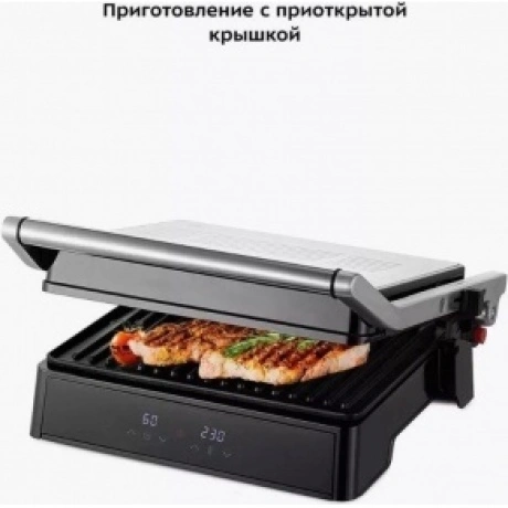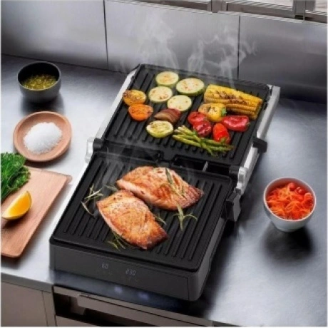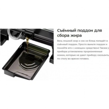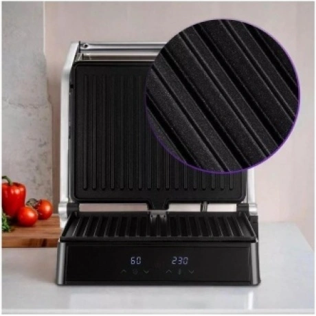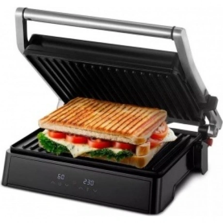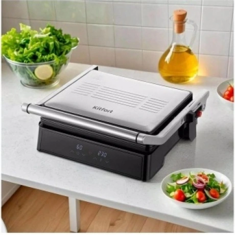 Гриль Kitfort КТ-3664 с двумя алюминиевыми нагревательными панелями подходит для приготовления мяса, рыбы, овощей, сосисок, сэндвичей, тостов. Температура нагрева в пределах 120-230°C обеспечивает равномерное обжаривание. Ребристая поверхность формирует на продуктах полосатую румяную корочку. Антипригарное покрытие исключает необходимость добавления масла. Верхняя крышка гриля Kitfort КТ-3664 открывается на 180°. Это дает возможность обжаривать продукты с одной стороны сразу на двух панелях. Для контроля времени работы и выбранной температуры спереди установлены 2 дисплея. Жир и сок стекают в поддон, который извлекается из корпуса для очистки.