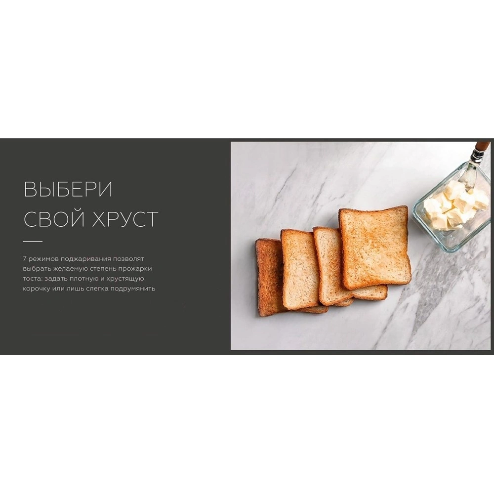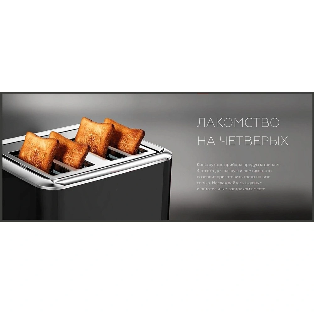 Тостер выполнен в элегантном черном цвете и имеет прочный корпус из пластика и металла, что обеспечивает долговечность устройства. С ним вы сможете наслаждаться идеальными тостами каждое утро, благодаря функции экстра подъема маленьких ломтиков хлеба и наличию съемного поддона для крошек для легкой очистки.