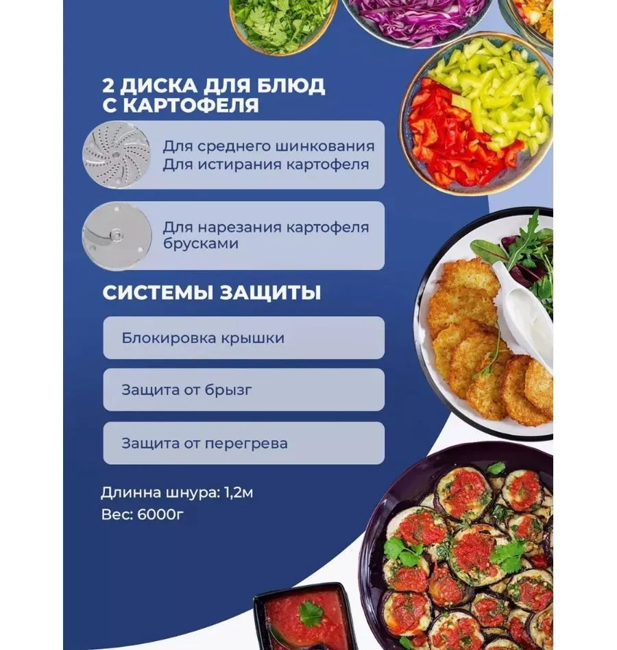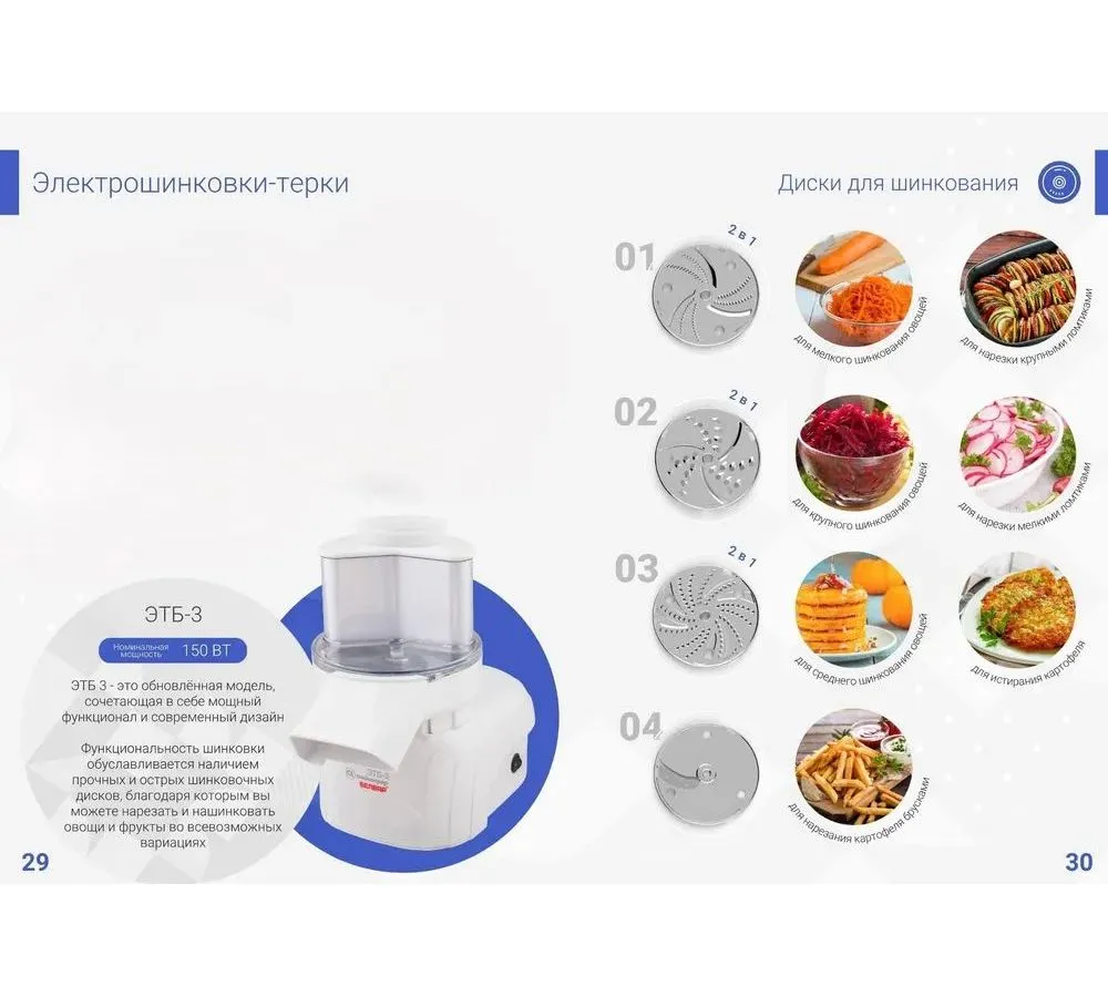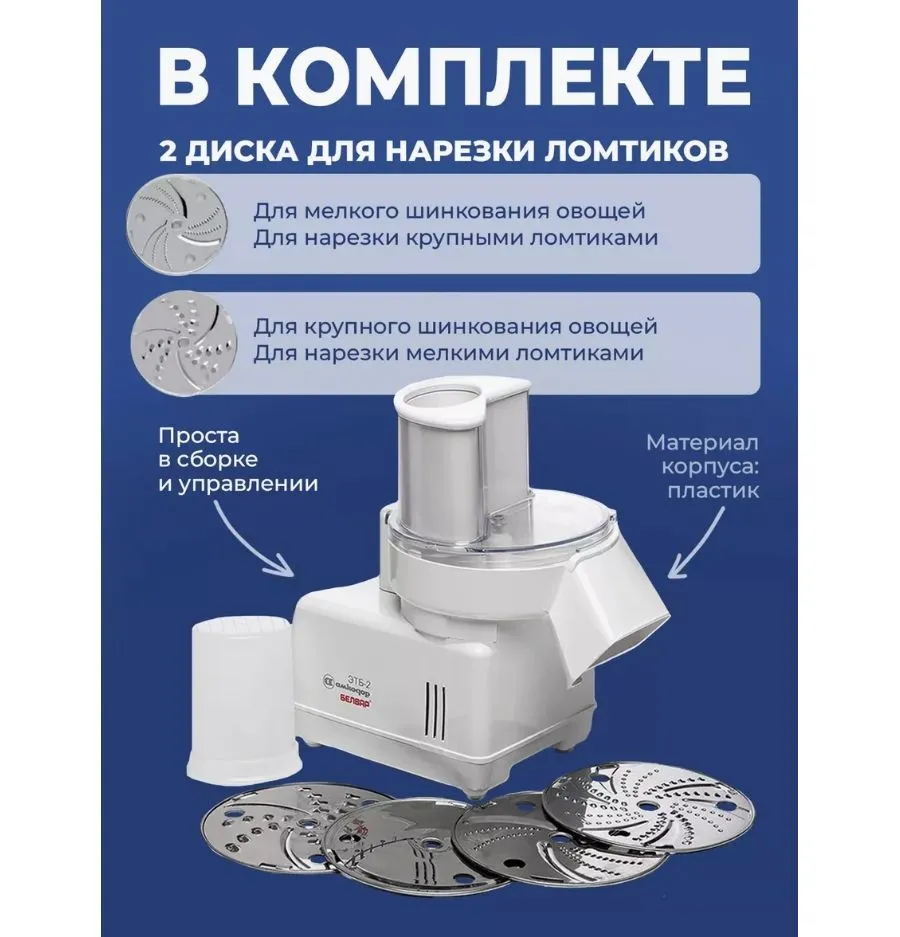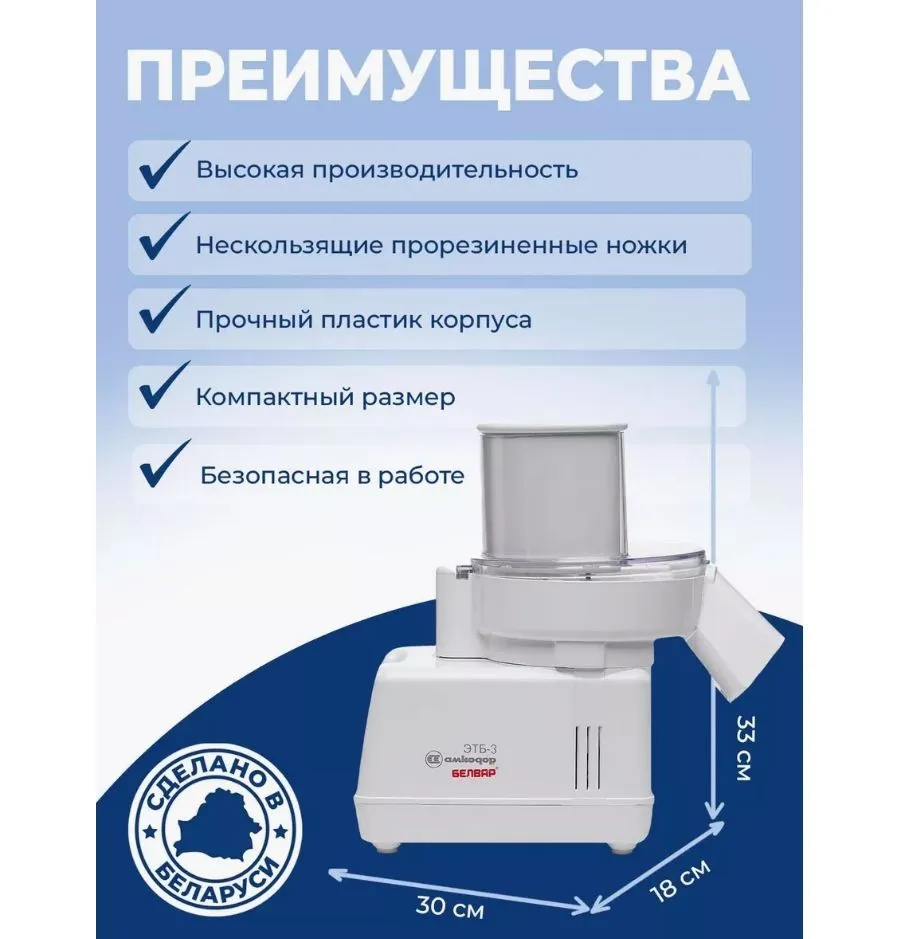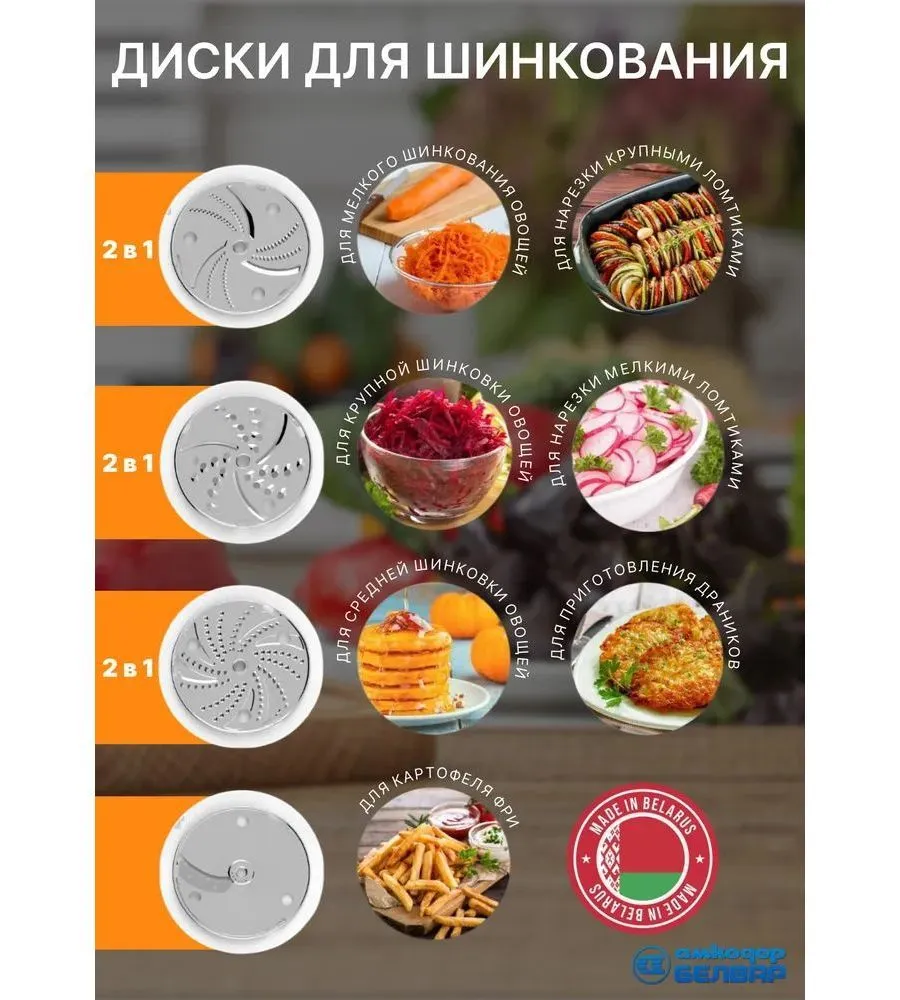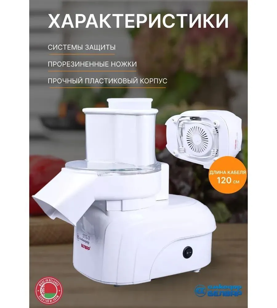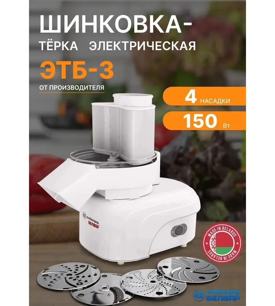 Дарим вам возможность превратить вашу кухню в настоящую кулинарную симфонию с кухонным комбайном Белвар ЭТБ-3! Эта электрошинковка-терка станет вашим верным помощником, готовым воплотить ваши кулинарные фантазии в реальность. В комплекте с кухонным комбайном вы найдете 3 многофункциональных диска для шинкования 2-в-1. С ними вы сможете создать на своей кухне истинное волшебство. Независимо от того, нужно ли вам крупное, среднее или мелкое шинкование овощей, нарезка крупными или мелкими ломтиками, истирание картофеля для драников или нарезка картофеля брусками для аппетитной картошки фри — эти диски готовы исполнить все ваши желания на кухне. И конечно, не забываем про то, что наш комбайн кухонный Белвар ЭТБ-3 создан с душой и старанием в Беларуси. Проверенное белорусское качество электрической шинковки-терки — это не просто слова, а залог надежности и долговечности каждого элемента. Именно поэтому он завоевал популярность среди домашних «шеф-поваров» и любителей готовить. Каждое блюдо станет настоящим шедевром, а ваша кухня превратится в настоящий гастрономический рай.
