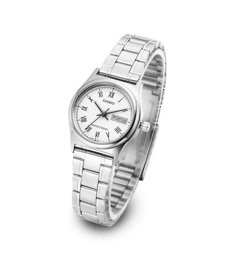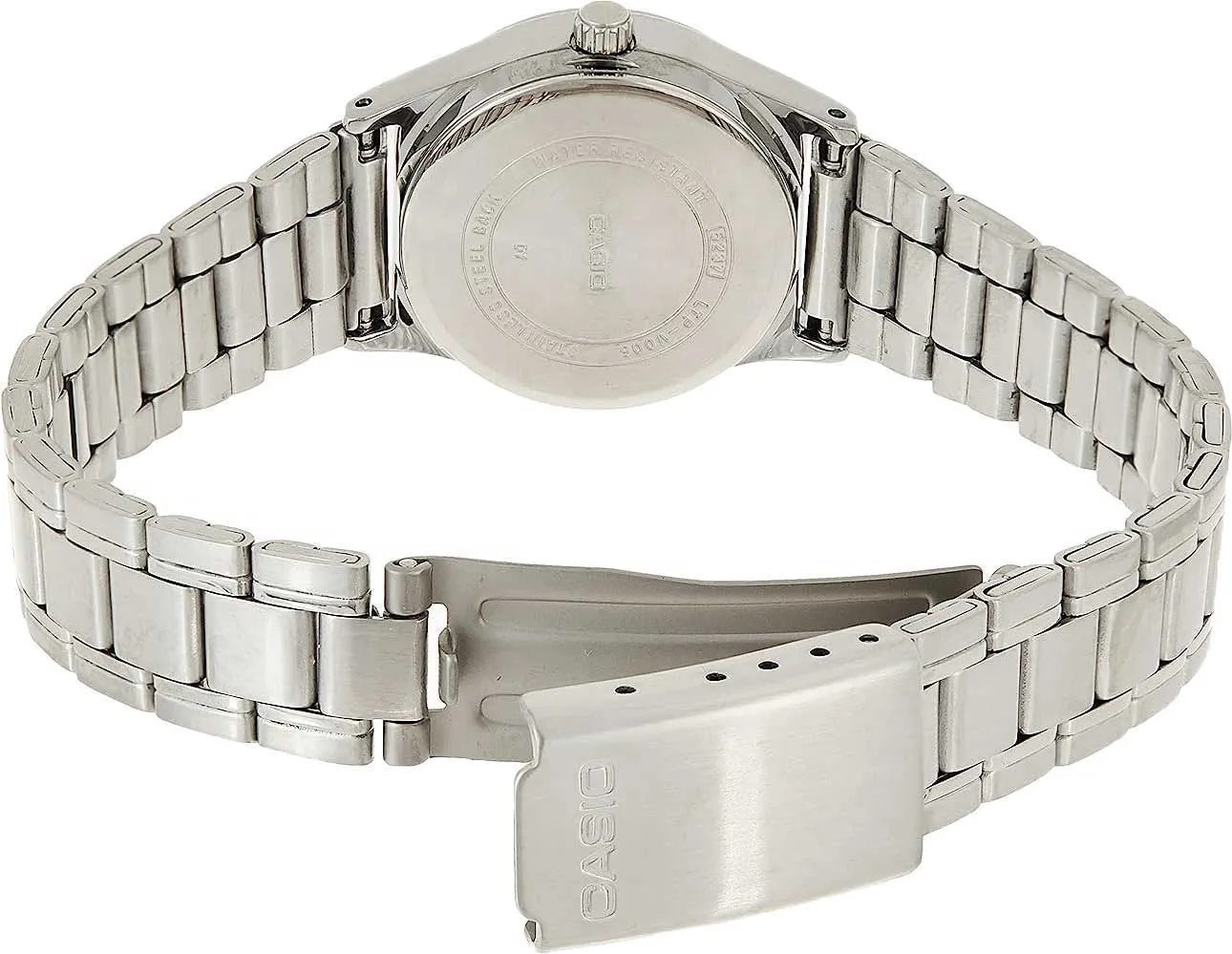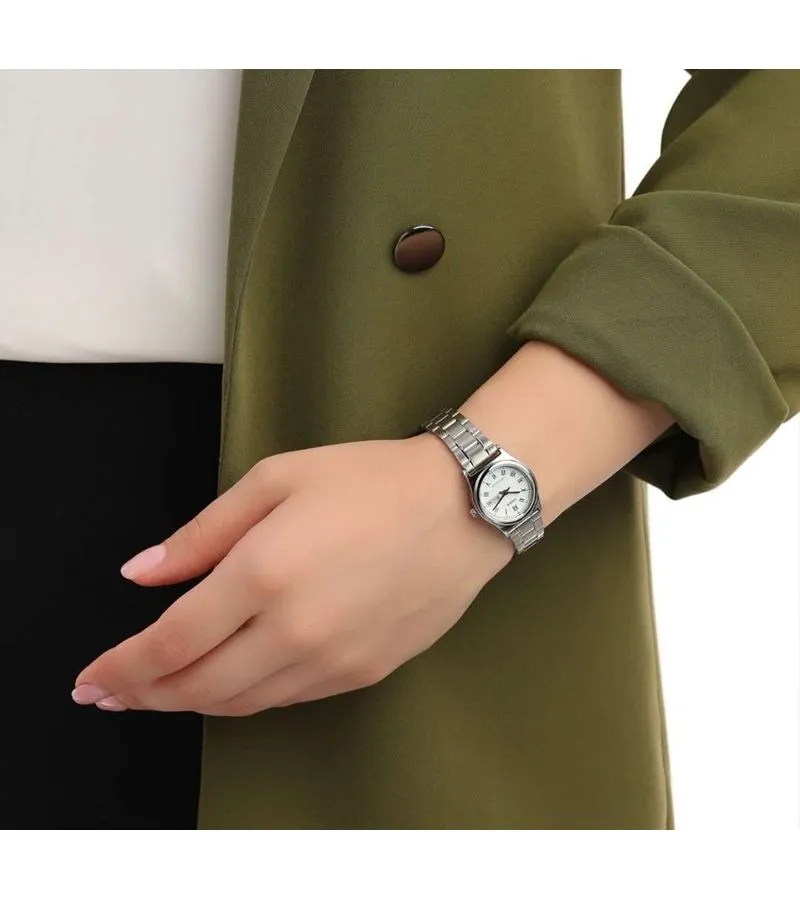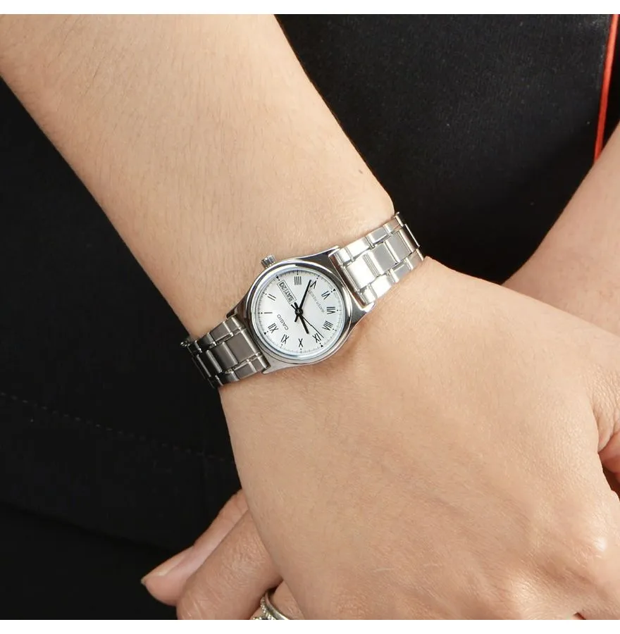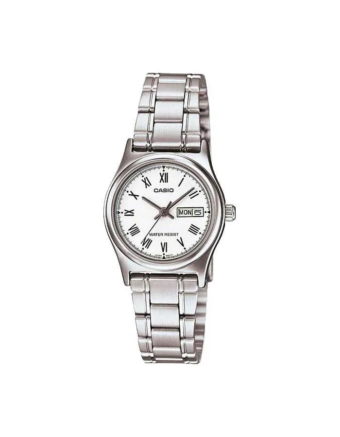 Классические женские часы Casio с круглым корпусом и стальным браслетом. Присутствует окошко даты и дня недели. Браслет с раскладывающейся застежкой. Вес часов 52 грамма.