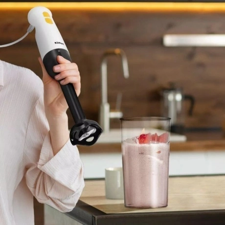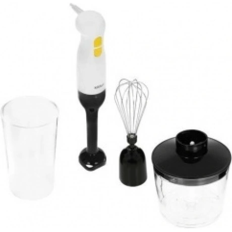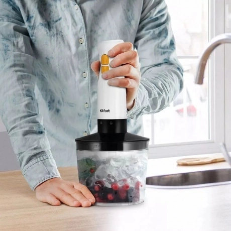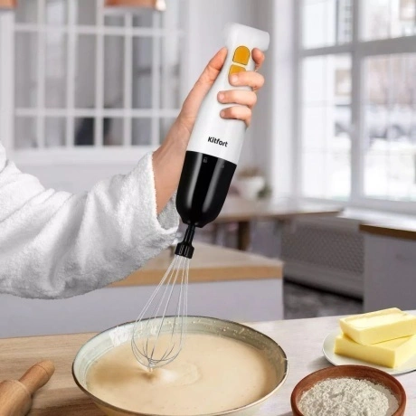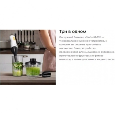 Погружной блендер «3 в 1» КТ-3511 – универсальное кухонное устройство, с которым вы сможете приготовить множество блюд. Устройство предназначено для смешивания, взбивания, приготовления фруктовых и фитнес-напитков, а также для замеса жидкого теста. Насадка-венчик предназначена для приготовления жидкого теста и взбивания яичных белков. Венчик обеспечивает равномерное смешивание ингредиентов, создавая идеальную консистенцию для выпечки или приготовления десертов. Насадка-блендер измельчает и смешивает ингредиенты в однородную консистенцию. Смешивать ингредиенты удобно во вместительном и глубоком пластиковом стакане ёмкостью 700 мл, который идет в комплекте с устройством. В чаше измельчителя можно быстро измельчить мясо, сыр, овощи или ягоды. Благодаря острым лезвиям и мощному двигателю, он молниеносно превращает мясо, сыр, овощи или ягоды в мелкую крошку или пюре. Погружной блендер имеет удобное и простое управление. Блендер оснащён двумя кнопками — кнопкой «Запуск» и кнопкой «Турбо», нажатие на которую включает прибор на максимальной скорости.