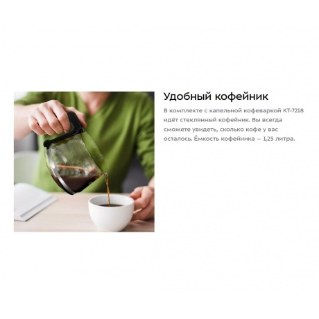 Капельная кофеварка КТ-7218 готовит ароматный чёрный кофе из молотого кофе. Управление кофеваркой очень простое и осуществляется при помощи одного переключателя. При приготовлении кофе вода нагревается, а затем подаётся в фильтр с молотым кофе. Многоразовым фильтром можно пользоваться неограниченное количество раз. Пройдя через фильтр, кофе поступает в стеклянный кофейник. В месте установки кофейника находится платформа для подогрева. При работе кофеварки, включается нагревательный элемент, расположенный под платформой. Благодаря остаточному теплу платформа подогревает напиток в кофейнике некоторое время после выключения. Резервуар для воды ёмкостью 1.25 л позволяет за один раз приготовить кофе на 10 чашек (по 125 мл). На резервуаре для воды и кофейнике нанесены соответствующие отметки, поэтому вам будет удобно приготовить нужное количество чашек кофе. В комплекте с капельной кофеваркой КТ-7218 идёт стеклянный кофейник. Вы всегда сможете увидеть, сколько кофе у вас осталось. Ёмкость кофейника – 1.25 литра.