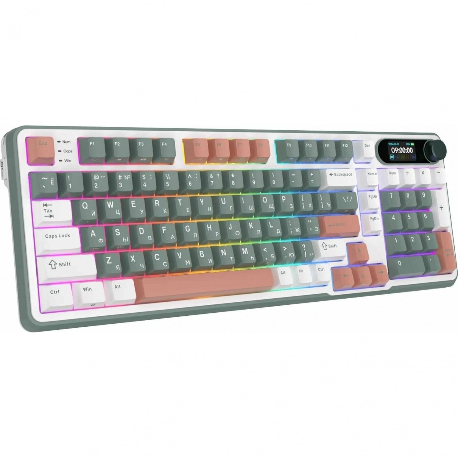 Клавиатура RK-S98 3-mode Camping выполнена в прочном пластиковом корпусе с использованием звукопоглощающих материалов. Она подключается к устройствам по интерфейсу Bluetooth, посредством радиоканальной технологии на частоте 2.4 ГГц и через USB-кабель. LCD-дисплей выводит основные параметры работы. Для переключения режимов и регулировки громкости установлен поворотный механизм.