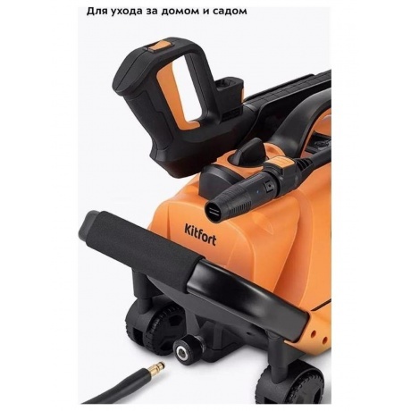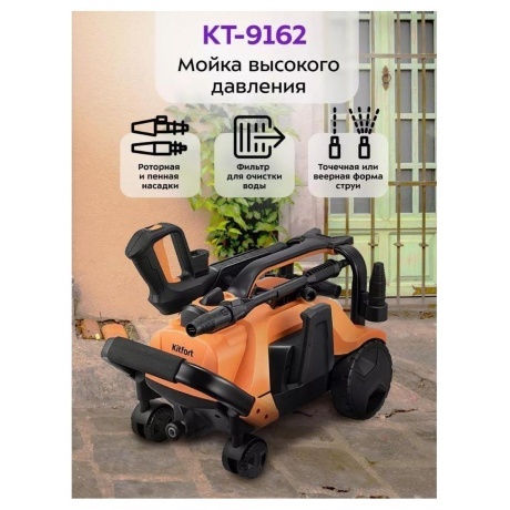 Мойка высокого давления Kitfort КТ-9162 предназначена для мытья автомобилей, садовых принадлежностей, фасадов, террас, плитки, кирпичной кладки и иных влагостойких поверхностей. Вы можете настраивать забор воды из отдельной емкости или водопровода. Встроенная система защиты отключает двигатель при перегреве. Есть возможность подключения пенной насадки с бутылкой для нанесения моющего средства на очищаемую поверхность.
