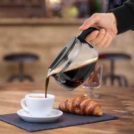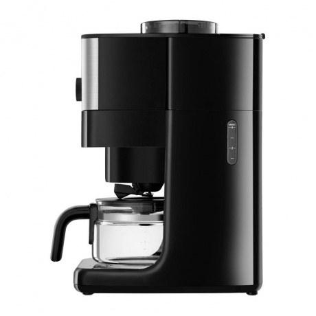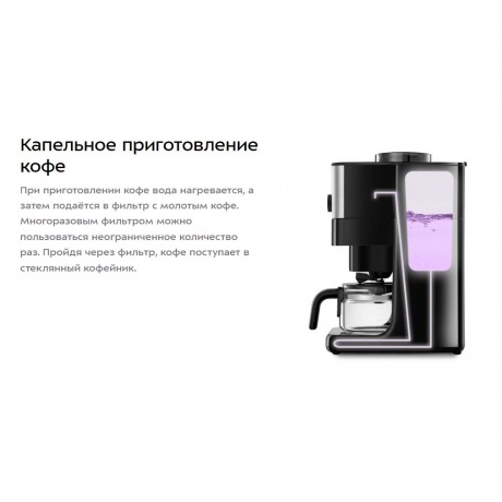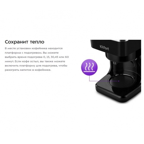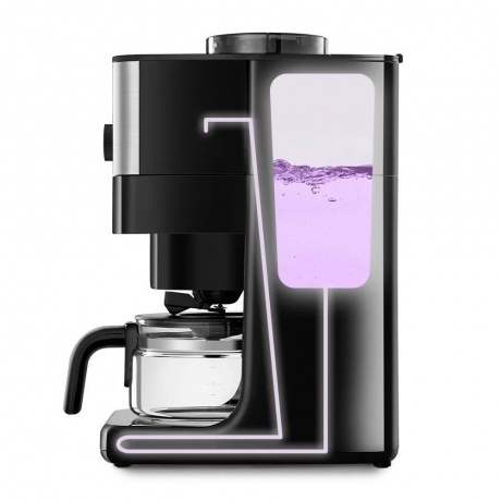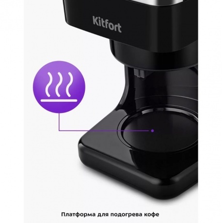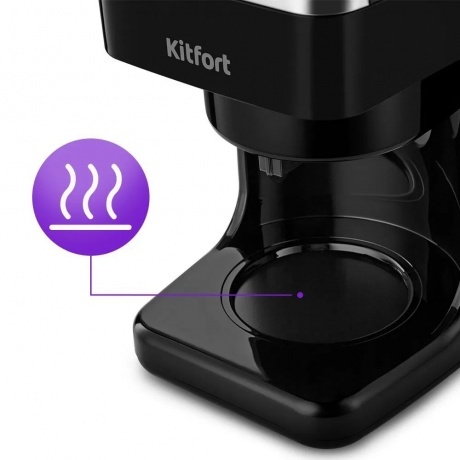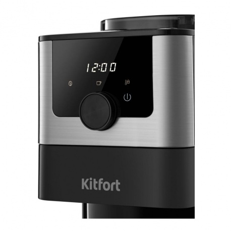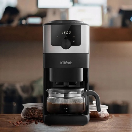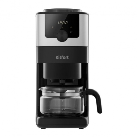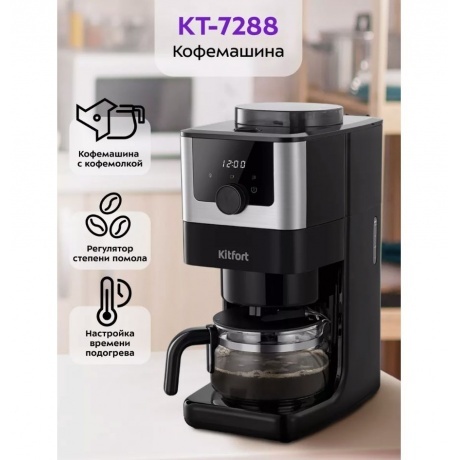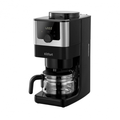 Капельная кофемашина Kitfort КТ-7288 готовит кофе из молотого кофе или из кофейных зёрен. Встроенная кофемолка с коническими жерновами может измельчать кофейные зёрна. КТ-7288 предназначена для приготовления кофе в домашних условиях или в офисе. При приготовлении кофе вода нагревается, а затем подаётся в фильтр с молотым кофе. Многоразовым фильтром можно пользоваться неограниченное количество раз. Пройдя через фильтр, кофе поступает в стеклянный кофейник. Управление осуществляется при помощи панели. На дисплее отображаются текущее время или время подогрева. При помощи кнопок можно включить очистку, разогрев и отложенный старт. Функция отложенного старта позволит начать приготовление в заданное время. В месте установки кофейника находится платформа с подогревом. Вы можете выбрать время подогрева 0, 15, 30.45 или 60 минут. Если кофе остыл, вы также можете включить платформу для подогрева, чтобы разогреть напиток в кофейнике. Кофемолка с коническими жерновами обеспечивает равномерный помол. Степень помола регулируется поворотом резервуара для зёрен. Резервуар для воды ёмкостью 0.6 л позволяет за один раз приготовить кофе на 4 чашки (примерно по 150 мл). В комплекте с капельной кофемашины КТ-7288 идёт стеклянный кофейник ёмкостью 0.6 литра. Вы всегда сможете увидеть, сколько кофе у вас осталось.