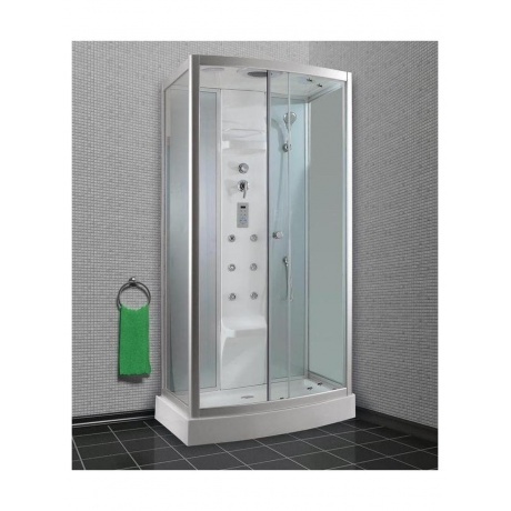 Душевая кабина TIMO - идеальная гармония размеров для ванной комнаты. Форма кабины - прямоугольник, позволяет максимально использовать пространство, не занимая много места. Поддон. Кабина оснащена низким поддоном высотой 15 см, изготовленным из прочного акрила. Наличие поддона обеспечивает защиту пола от воды и облегчает очистку. Гидромассаж спины в комплекте с кабиной. Количество форсунок спинного массажа – 6.. Стекла и профиль. Дверь кабины выполнена из прозрачного стекла толщиной 6 мм. Задняя стенка выполнена из матового стекла. Профиль изготовлен из прочного алюминия и окрашен в хромовый цвет. Электрика. Душевая кабина Timo работает от сети 220-240 В. Кабина оснащена верхним освещением, вентиляцией и радио.