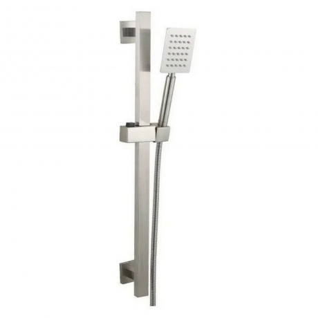 Душевой гарнитур сатин штанга: прямоугольная 30х18 мм, сталь SUS304, H=600 мм ручная лейка: 100х80 мм, сталь SUS304, антикальк шланг: 1500 мм, оплётка сталь SUS304 индивидуальная упаковка