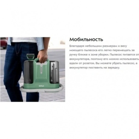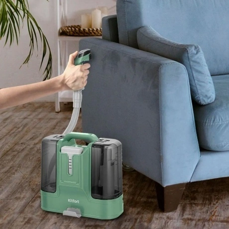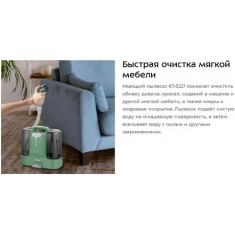 Моющий пылесос КТ-5217 поможет очистить обивку дивана, кресел, сидений в машине и другой мягкой мебели, а также ковры и ковровые покрытия. Пылесос подаёт чистую воду на очищаемую поверхность, а затем всасывает воду с пылью и другими загрязнениями.