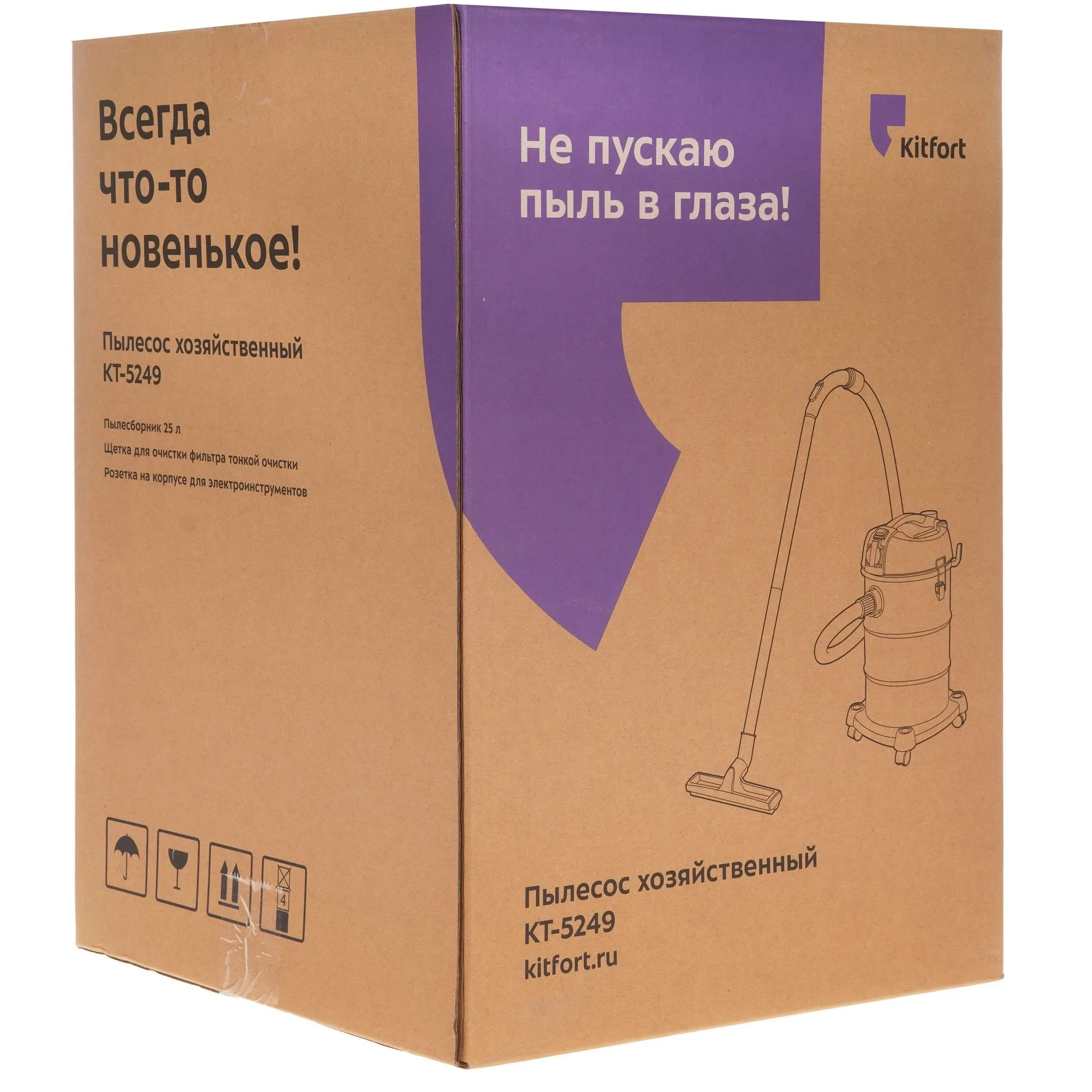 Пылесос хозяйственный КТ-5249 предназначен для уборки бытовых помещений различной площади. Устройство способно собирать мелкий мусор, а также пролитую на пол воду. Большой пылесборник ёмкостью 25 литров подходит для уборки после ремонта, а очистить пылесборник очень легко. На корпусе пылесоса есть ручка щётки для прочистки фильтра тонкой очистки, т.е. прочистить фильтр можно этой щёткой, не снимая с пылесоса.