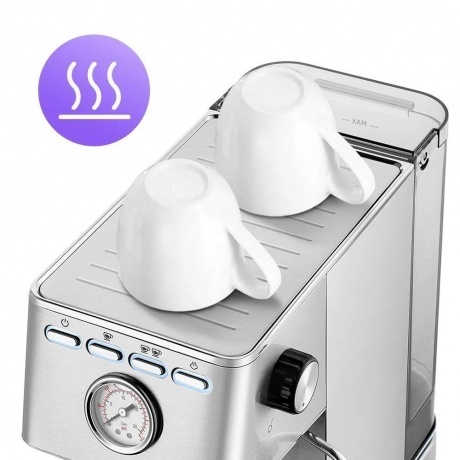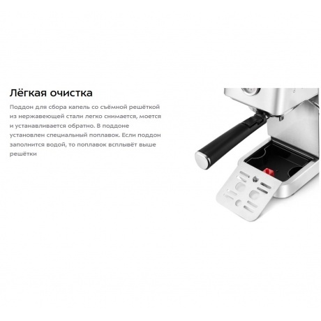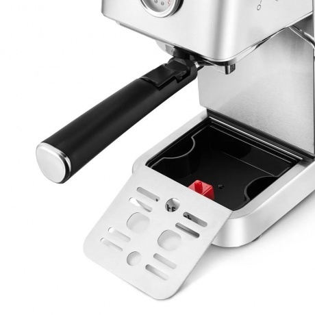 Кофеварка КТ-7254 поможет приготовить кофе эспрессо, капучино или латте, а также множество других видов кофе на ваш вкус. С помощью стимера вы можете приготовить молочную пенку, а также подогреть паром остывший чай или молоко. Манометр показывает давление в бойлере для открытия клапана подачи воды в рожок. Если давление слишком высокое, вероятно, кофе утрамбован слишком плотно или помол слишком мелкий и кофе забил фильтр. Оптимальное давление для эспрессо — 9 бар. Кофеварка КТ-7254 поможет приготовить кофе эспрессо, капучино или латте, а также множество других видов кофе на ваш вкус. С помощью стимера вы можете приготовить молочную пенку, а также подогреть паром остывший чай или молоко. Для подачи пара и горячей воды в кофейной станции есть паровая трубка – стимер. Стимер погружают в холодное молоко, включают подачу пара и взбивают молочную пенку. С помощью стимера вы также можете подогреть остывший чай или молоко. Вместительный резервуар для воды объёмом 1.4 л легко снимается и наполняется водой. Также его удобно чистить. Если вода в резервуаре закончится, об этом сообщит специальный индикатор отсутствия воды. На платформе можно хранить темпер или ставить чашки, чтобы они были тёплыми или лучше сохли после мытья. На платформе удобно размещать чашки во время приготовления молочной пены. К моменту, когда вы закончите, чашки успеют подогреться. Мерная ложка-темпер, которая идёт в комплекте, служит для того, чтобы удобно насыпать молотый кофе. Обратная сторона поможет утрамбовать кофейную таблетку. В комплекте идёт одинарный, а также фильтр для двойного эспрессо, если хотите более крепкий кофе. Поддон для сбора капель со съёмной решёткой из нержавеющей стали легко снимается, моется и устанавливается обратно. В поддоне установлен специальный поплавок. Если поддон заполнится водой, то поплавок всплывёт выше решётки.