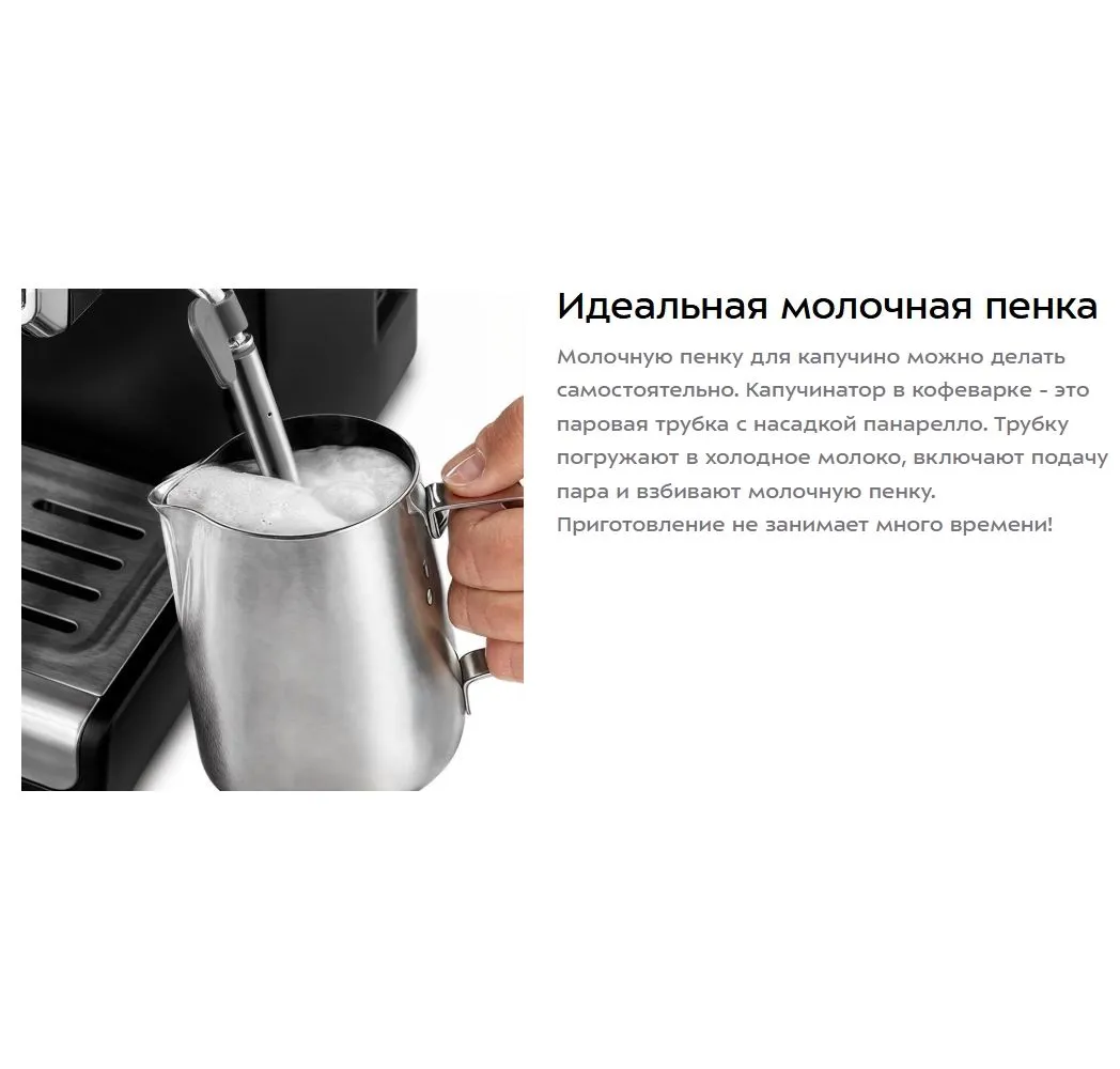 Рожковая кофеварка КТ-7255 поможет приготовить кофе эспрессо, капучино или латте, а также множество других видов кофе на ваш вкус. С помощью рожковой кофеварки также можно подогреть сок, остывший чай и другие напитки.