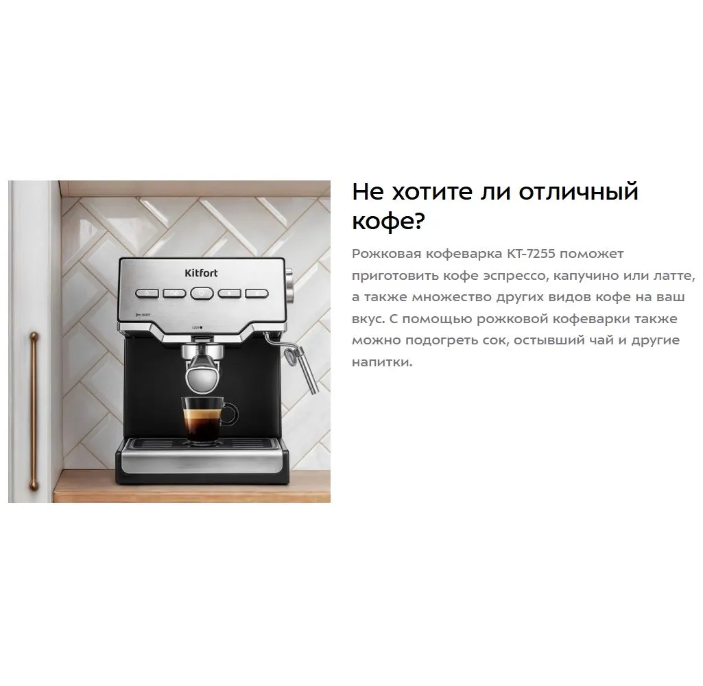 Кофеварка рожковая Kitfort КТ-7255 - характеристики, описание товара, фото и цены представлены на карточке товара. Этот товар вы можете купить по цене 6990 руб., позвонив по телефону 8(495)137-52-98 в Москве, или оформив покупку через корзину.
