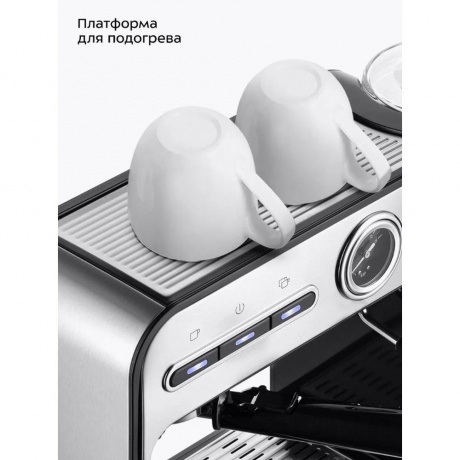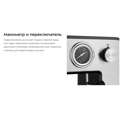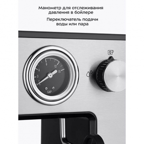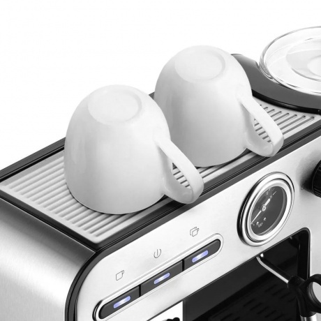 Кофеварка КТ-7515 поможет приготовить кофе эспрессо, капучино или латте, а также другие виды кофе на ваш вкус. С помощью стимера вы можете приготовить молочную пенку, а также подогреть паром остывший чай или молоко. Управление происходит с помощью нескольких кнопок – «Вкл/Выкл» включает и отключает нагрев кофеварки, «Эспрессо» включает приготовление одной порции эспрессо, «Двойной эспрессо» включает приготовление двух порций эспрессо. Молочную пенку для капучино можно сделать самостоятельно. Для приготовления пара и горячей воды в кофеварке есть стимер. Стимер погружают в холодное молоко, включают подачу пара и взбивают молочную пенку. Насадка панарелло облегчает процесс приготовления. Переключатель включает подачу горячей воды или пара. Манометр позволяет отслеживать давление в бойлере, необходимое для открытия клапана для подачи воды в рожок. Резервуар для воды ёмкостью 1 литр съёмный – его можно легко снять и наполнить водой в любом удобном месте. Крышка резервуара для воды также легко снимается, поэтому можно заливать воду в резервуар, не снимая его. Платформа для подогрева не имеет собственного нагревательного элемента, она нагревается от бойлера. Часть платформы для подогрева, которая находится дальше от бойлера, будет слегка тёплой. На платформу кладут рожок, фильтры и чашки, чтобы прогреть их. Рожковая кофеварка – отличный выбор для гурманов, желающих ежедневно наслаждаться полным букетом вкуса свежего кофе. Особая технология приготовления позволяет сохранить большое количество полезных веществ и тонкий аромат напитка. Кофеварка оснащена металлическим рожком. Он хорошо прогревает напиток, а сам напиток получается насыщенным, густым и с хорошей пенкой. Мерная ложка-темпер поможет наполнить рожок и утрамбовать в нём кофейную таблетку.