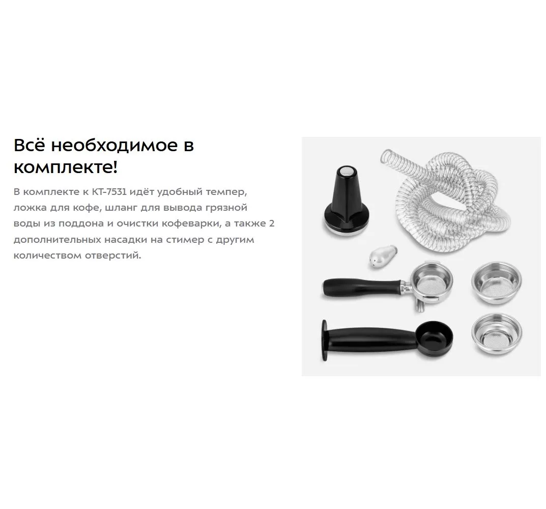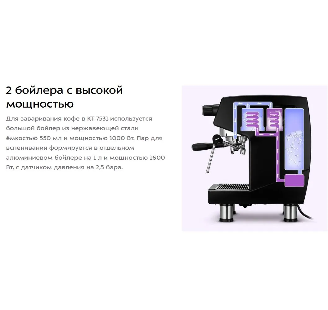 На страже вашей бодрости!. Кофеварка КТ-7531 поможет приготовить эспрессо, капучино или латте, а также множество других видов кофе на ваш вкус. С помощью стимера вы можете приготовить молочную пенку, а также подогреть паром остывший напиток.