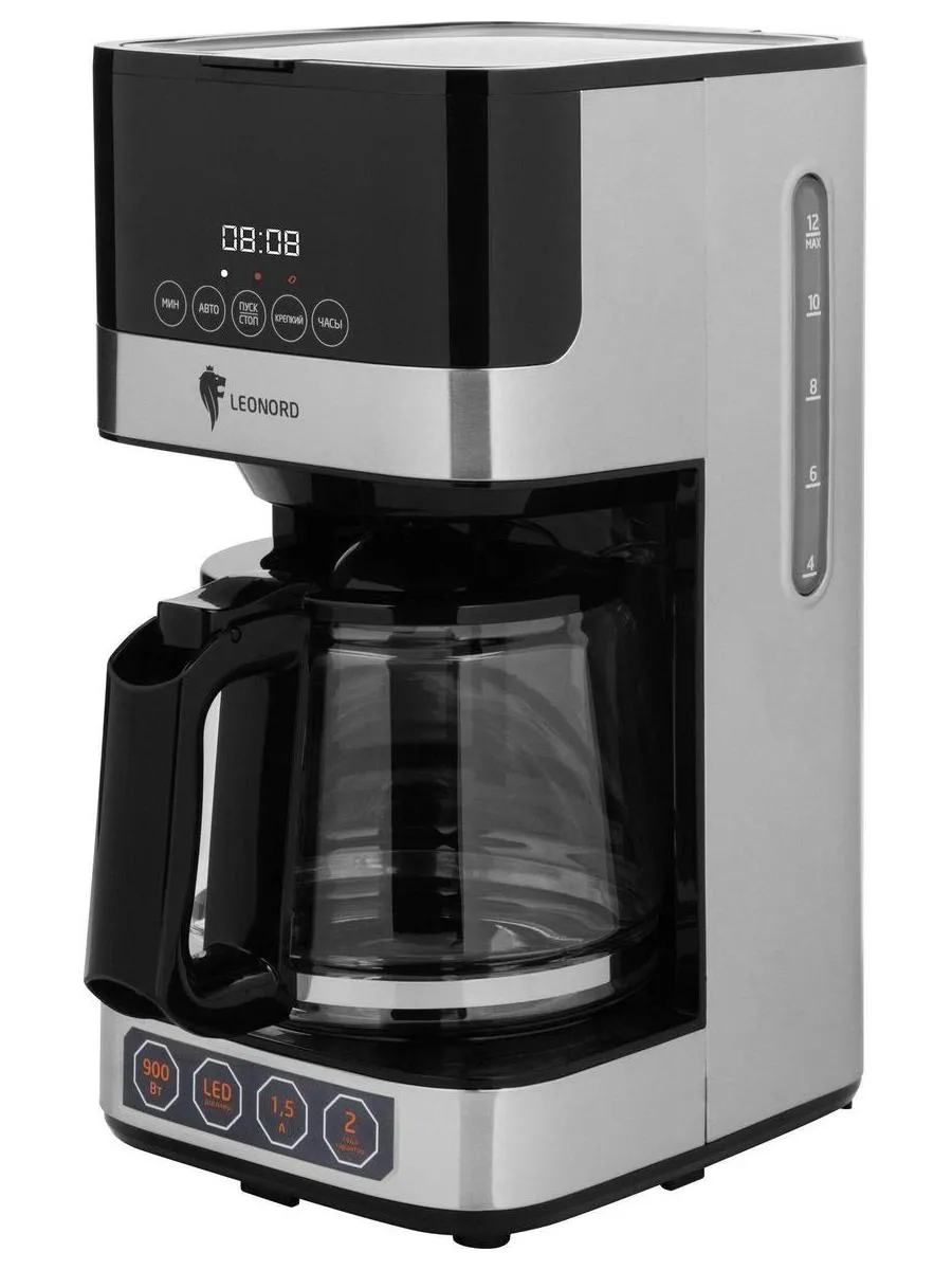 С кофеваркой Leonord вы получаете кофе непревзойденного вкуса. Она позволяет настроить крепость напитка, а также поддерживает температуру уже приготовленного кофе в течение 40 минут, кофеварка автоматически отключается по истечении времени. Кофеварка оснащена многоразовым фильтром, защитой от капель и автоматическим отключением. Стеклянный кувшин изготовлен из высококачественного термостойкого стекла, обеспечивающий длительный срок службы. Кофеварка имеет функцию отложенного старта, которая позволяет приготовить напиток к заданному времени. По утрам, как только Вы проснетесь, Вас уже будет ждать готовый, бодрящий и ароматный кофе!