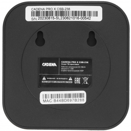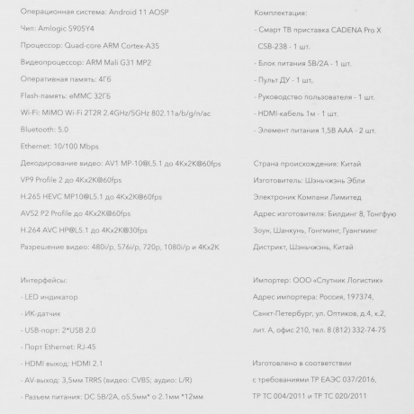 Медиаплеер Cadena PROxCSB-238 оснащен набором интерфейсов для подключения к ТВ, работы с внешними накопителями, связи с мобильными устройствами. Вы можете настраивать доступ в Интернет по LAN-порту или Wi-Fi. Процессор ARM Cortex-A35 с ОЗУ 4 Гб не дает системе зависать при сложных запросах и трансляции потокового видео. 32 Гб встроенной памяти хватает для установки разных приложений. Cadena PROxCSB-238 позволяет смотреть видео в 4K-разрешении, а также воспроизводить 3D-видео. Последняя функция зависит от программы, которой вы будете пользоваться. С медиаплеером можно включать субтитры и улучшать качество изображения с помощью HDR. Есть поддержка голосовых команд, управления ТВ и медиаплеером с помощью 1 пульта.