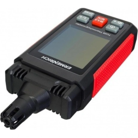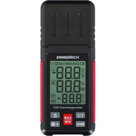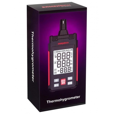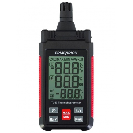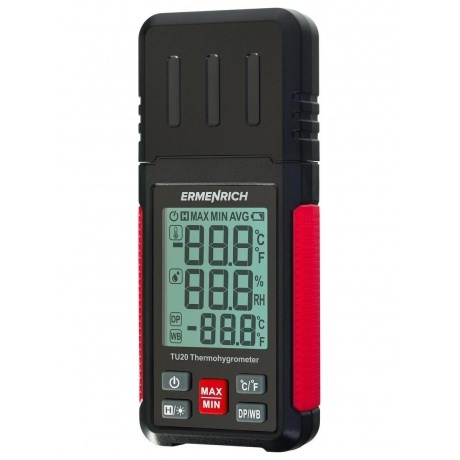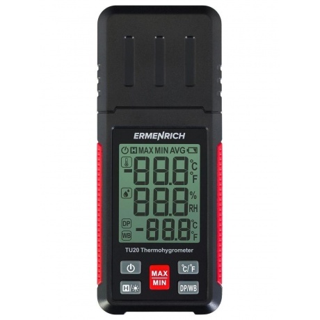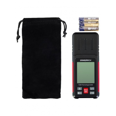 Термогигрометр Ermenrich Wett TU20 – портативный прибор для контроля микроклимата на рабочем месте, на производстве или в быту. Он позволяет оперативно отслеживать изменения температуры и влажности в помещении и на улице. Термометр определяет температуру в диапазоне от –20 до +60 °C, также можно настроить прибор, чтобы показания отображались в градусах по Фаренгейту. Гигрометр измеряет влажность в диапазоне 0–100% и определяет точку росы. Есть функция удержания показаний и запоминания минимальных и максимальных значений. Для питания необходимы 3 батарейки типа ААА (нет в комплекте). Индикатор низкого заряда батареи показывает, когда потребуется заменить источники питания. Функция автоотключения позволяет экономить энергию.