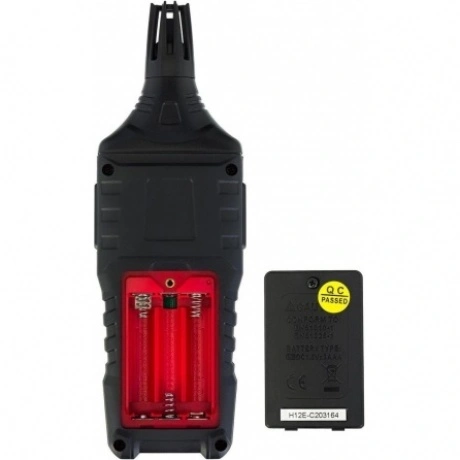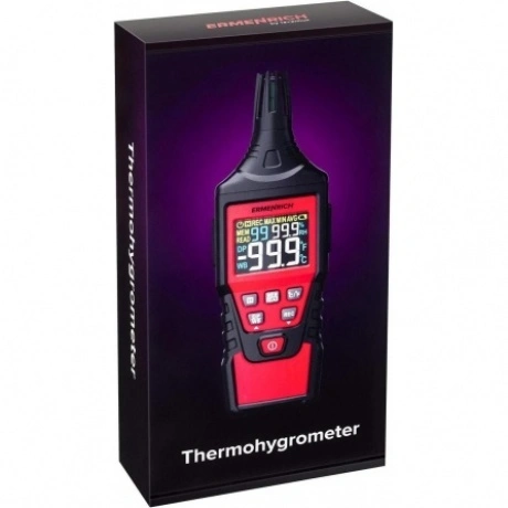 Ermenrich Wett TU30 – компактный и удобный прибор для измерения температуры и влажности в помещениях разного назначения (жилых, офисных, промышленных), а также на улице. Благодаря этому контроль микроклимата дома и на работе становится проще. Измерение температуры доступно в диапазоне от –20 до +60 °C. Также можно настроить отображение показаний в °F. Влажность измеряется в процентах, от 0 до 100, с разрешением в 0.1%. Также прибор определяет точку росы. Термогигрометр имеет функцию запоминания предельных значений и удержания показаний. Для питания прибора используются батарейки типа ААА (не входят в комплект). Для экономии энергии присутствует функция автоматического отключения при бездействии. Индикатор низкого заряда батареи помогает своевременно менять элементы питания.