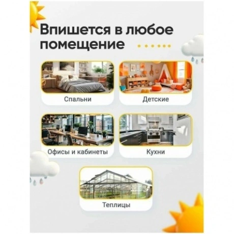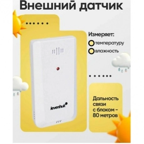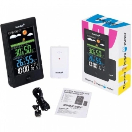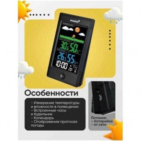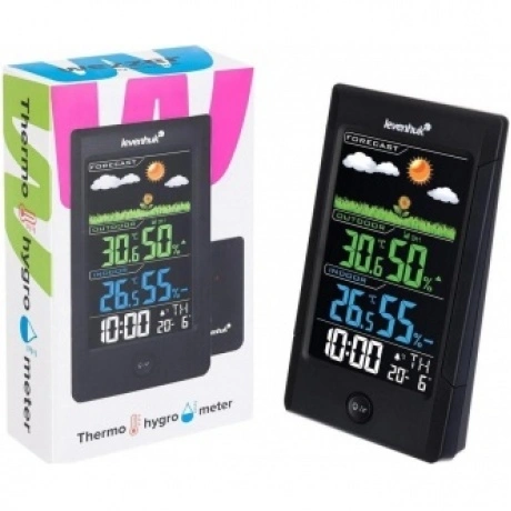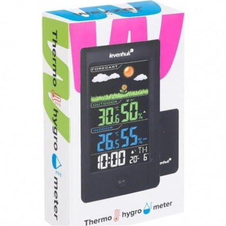Термогигрометр Levenhuk Wezzer Teo TH40 – стильная модель погодного гаджета для дома или офиса. Имеет контрастный цветной экран с подсветкой и дополнен беспроводным термогигродатчиком, который можно разместить на удалении до 80 метров от основного блока. Помимо измерения температуры и влажности воздуха прибор также показывает время, дату, день недели, погодные тренды и прогноз погоды. Есть встроенный будильник с функцией отложенного повтора. Экран прибора разделен на четыре логических блока. Вверху в форме красочного изображения можно увидеть прогноз погоды, доступно несколько значений: «солнечно», «переменная облачность», «облачно», «дождь». Прямо под ним находится блок, где можно увидеть температуру и влажность воздуха, измеряемые датчиком. Еще ниже – аналогичные измерения для основного модуля. Самый нижний блок – часы с календарем и будильником. Блоки окрашены в разные цвета, поэтому информация легко и быстро воспринимается. Практически все кнопки управления вынесены на заднюю стенку, кроме одной – это совмещенная кнопка для включения подсветки экрана и повтора будильника. Прибор подразумевает только настольное размещение, крепления на стену здесь нет. Датчик не имеет экрана, может быть установлен двумя способами: на любую горизонтальную поверхность или на саморез при помощи стандартного крепления на задней крышке.