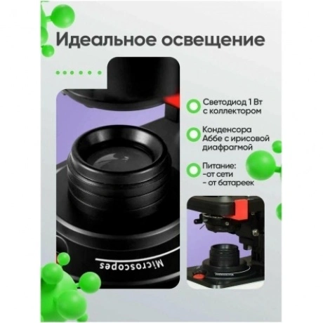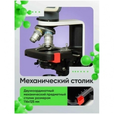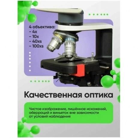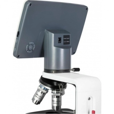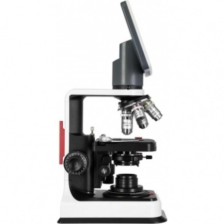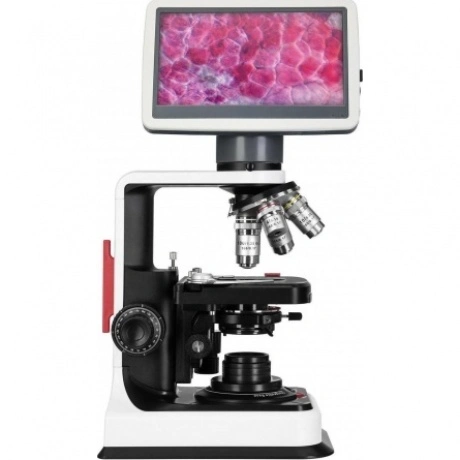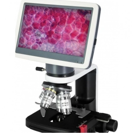 Цифровой микроскоп Levenhuk D450L – это незаменимый инструмент для проведения академических, биологических исследований, медицинских анализов и экологических тестов, который оценят специалисты из всех сфер науки. Общее увеличение микроскопа находится в диапазоне от 40 до 1000 крат, благодаря чему он отлично подходит для изучения органических клеток, бактерий, различных микроорганизмов, микроводорослей, простейших. Метод наблюдения – по светлому полю в проходящем свете, также есть возможность применения масляной иммерсии (флакон со специальным маслом входит в комплект поставки). Микроскоп Levenhuk D450L не имеет классической визуальной насадки – вместо нее он оснащен ярким LCD-экраном с диагональю 7 дюймов. Такое устройство позволяет проводить длительные исследования образцов с максимальным комфортом для шеи и глаз как в индивидуальной, так и в коллективной работе. В револьверном устройстве микроскопа установлены 4 ахроматических объектива – 4, 10, 40, 100 крат, формирующих чистое изображение, лишенное искажений, аберраций и виньеток вне зависимости от условий наблюдения. Объектив 100х подходит для масляной иммерсии, и также, как и объектив 40х, оснащен защитной пружинящей оправой. Нижняя часть микроскопа состоит из светодиодной подсветки с коллектором и функцией настройки яркости, предметного столика, конденсора Аббе с ирисовой диафрагмой и держателем для фильтра. Для фокусировки прибора с обеих сторон корпуса коаксиально расположены рукоятки грубой и точной настройки. Levenhuk D450L питается от сети 100–240 В через адаптер переменного тока или от 3 батареек типа АА (в комплект не входят) – в зависимости от желания пользователя сделать микроскоп портативным устройством.