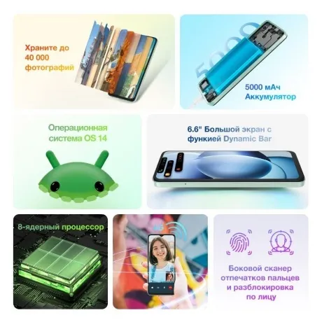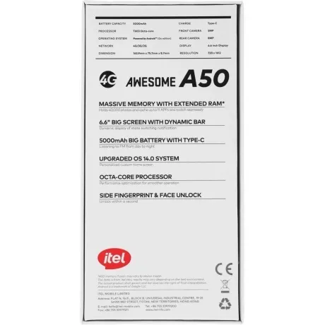 ITEL A50 — это бюджетный смартфон, выпущенный в 2024 году, который предлагает базовые функции и хорошее соотношение цены и качества. Он оснащен 6.6-дюймовым IPS HD+ экраном с разрешением 1612x720 пикселей и соотношением сторон 20:9, что делает его удобным для просмотра мультимедийного контента. Экран поддерживает технологию Multitouch и частоту обновления 60 Гц, а сенсор — 120 Гц.