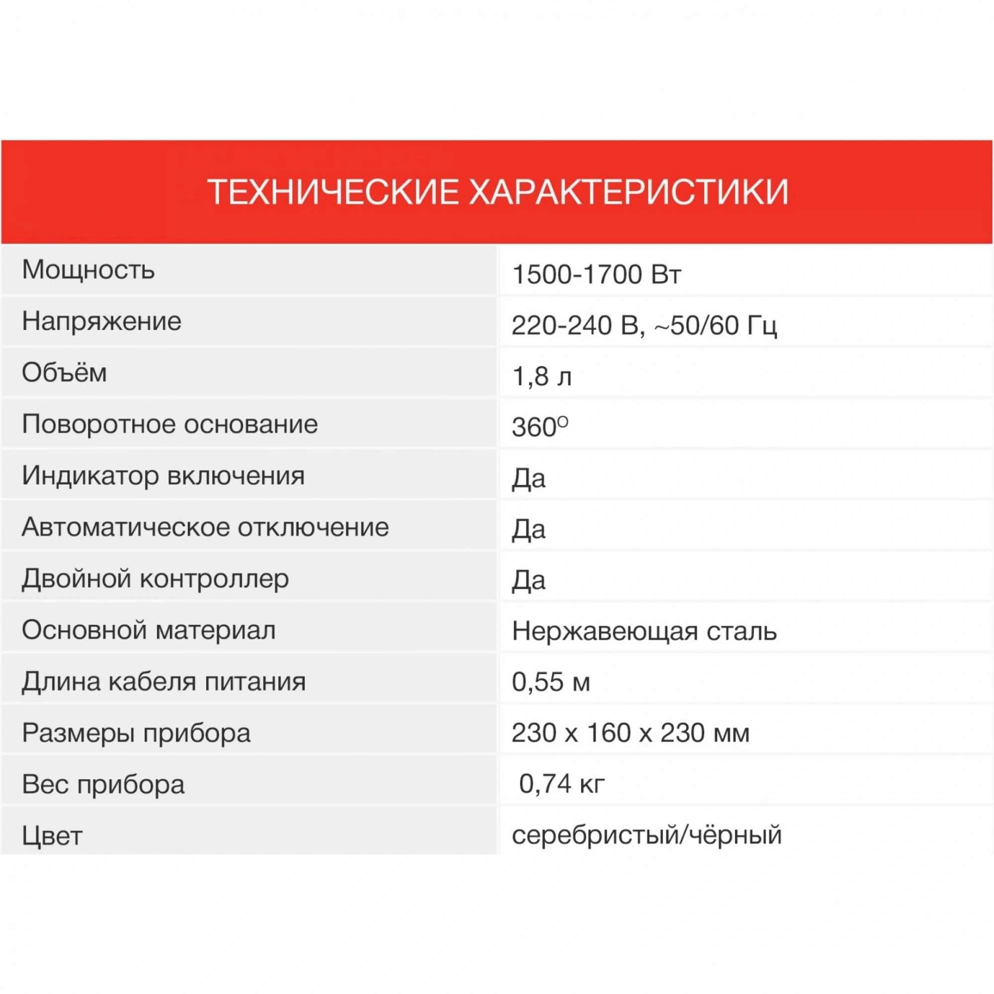С весом всего 0,74 кг, этот чайник отличается легкостью и удобством в использовании. Благодаря скрытому нагревательному элементу, вода в чайнике быстро нагревается, а мощность 1700 Вт обеспечивает эффективную работу прибора. Объем 1,8 литра позволяет закипятить достаточное количество воды для приготовления чая, кофе или других горячих напитков для всей семьи или небольшой компании друзей.