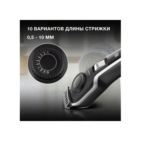 Машинка для стрижки Hyundai H-HC7127 сочетает в себе стильный дизайн и обилие полезных функций. Девайс питается от аккумулятора, благодаря чему не использует провод, а значит, не сковывает движений парикмахера. Батарея заряжается всего за 1.3 часа и работает после этого до 90 минут непрерывно. Она позволяет прибору работать с мощностью до 5 Вт – этого достаточно для быстрой и чистой стрижки в любых условиях. Hyundai H-HC7127 работает на одной скорости и может оставлять длину волос от 0.5 до 10 мм. Благодаря такой особенности с прибором удобно делать профессиональные градиенты по длинам шевелюры – фейды. Раньше такое было возможно только в парикмахерской. Чёрный лаконичный корпус устройства выполнен из лёгкого и прочного пластика, окрашенного в стильный чёрный цвет. Его удобно держать в руках даже в течение длительной стрижки. Руки не устают. Изменение параметров стрижки осуществляется с помощью колесика на верхней части прибора, включается девайс посредством кнопки ниже, а на рукояти Hyundai H-HC7127 есть информационный яркий экран, показывающий текущий заряд батареи. По нему удобно ориентироваться, не пора ли поставить машинку на зарядку.