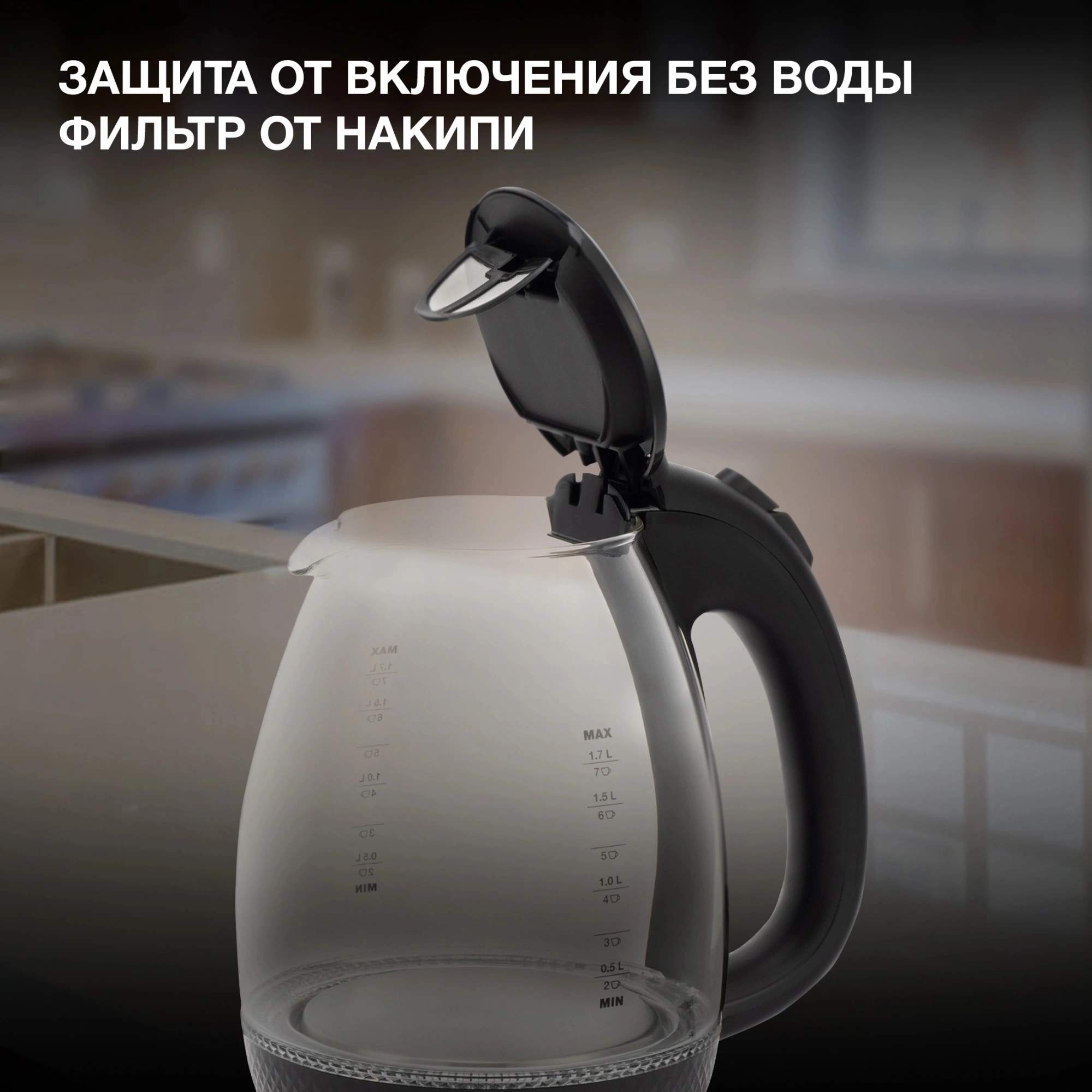 Максимально он вмещает до 1.7 л – этого объёма хватает на чаепитие большой семьи. Корпус девайса изготовлен из боросиликатного стекла. Выбор пал на этот материал неслучайно, ведь именно данная разновидность стекла наилучшим образом удерживает температуру и долгое время не даст жидкости остыть. На бока удобно нанесена градация, с помощью