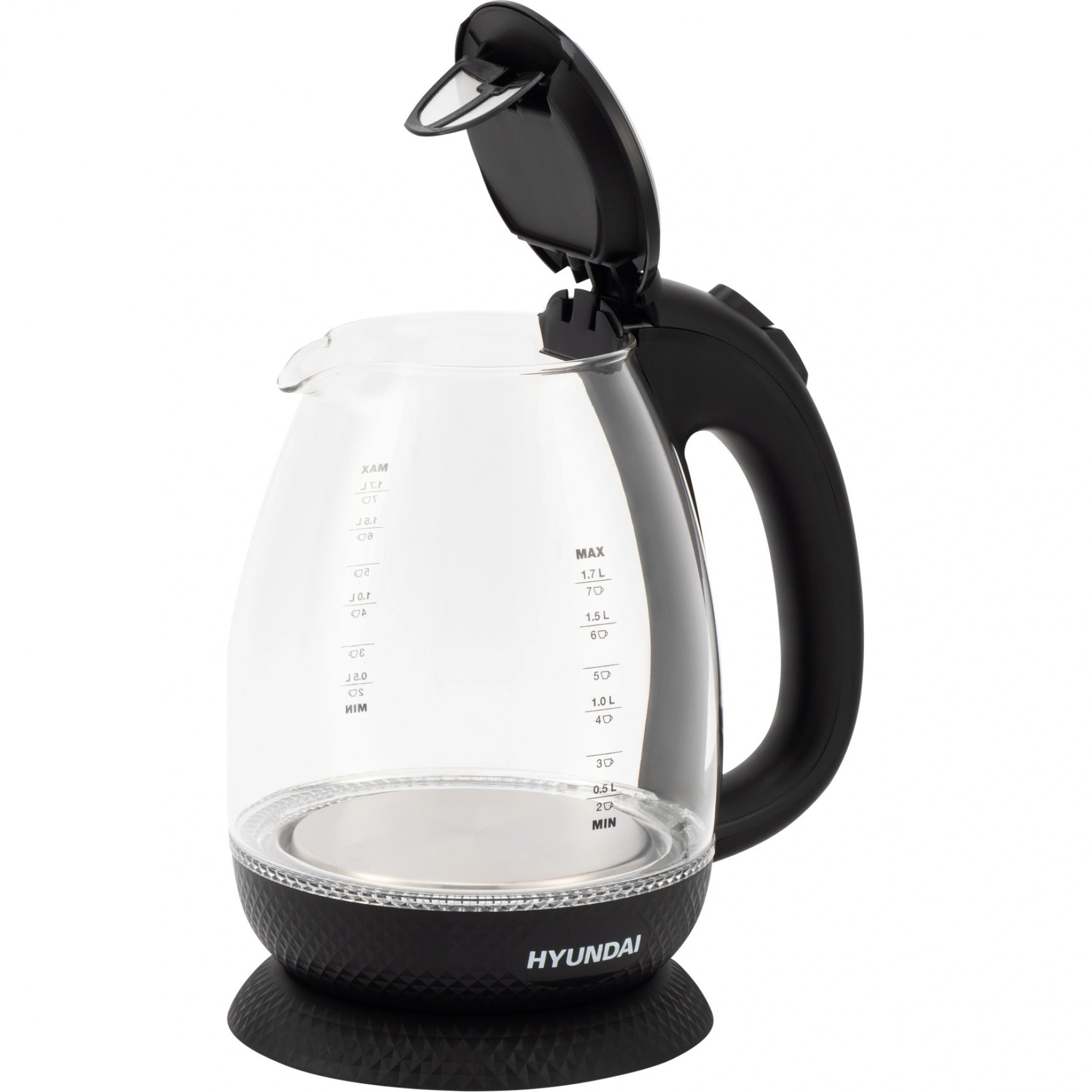 Крышка Hyundai HYK-G3804 открывается по щелчку кнопки. В носик электрического чайника встроен мелкодисперсный фильтр, не дающий накипи проникать в чашку во время налива.