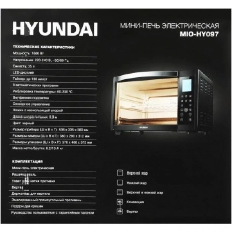 Мини-печь Hyundai MIO-HY097 35л. 1600Вт черный - фото, характеристики, описание и цена представлены на карточке товара. Для того чтобы купить этот товар по цене 10837 руб., вам надо или позвонить по телефону 8(495)137-52-98 в Москве, или оформить покупку в личном кабинете, добавив товар в корзину.