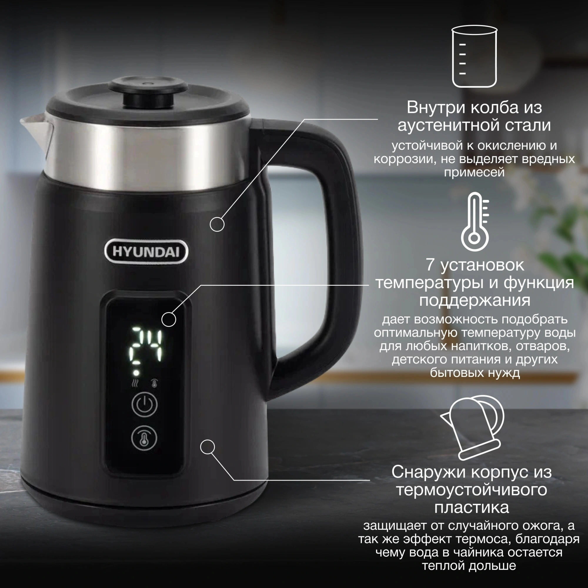 Практичная съемная крышка позволяет удобно добавлять воду и очищать чайник. Чёрный цвет в сочетании с корпусом из металла и пластика придаёт чайнику стильный и современный вид, который гармонично впишется в любой интерьер кухни. Электрочайник HYUNDAI – это надежность, функциональность и эстетика в каждой детали.