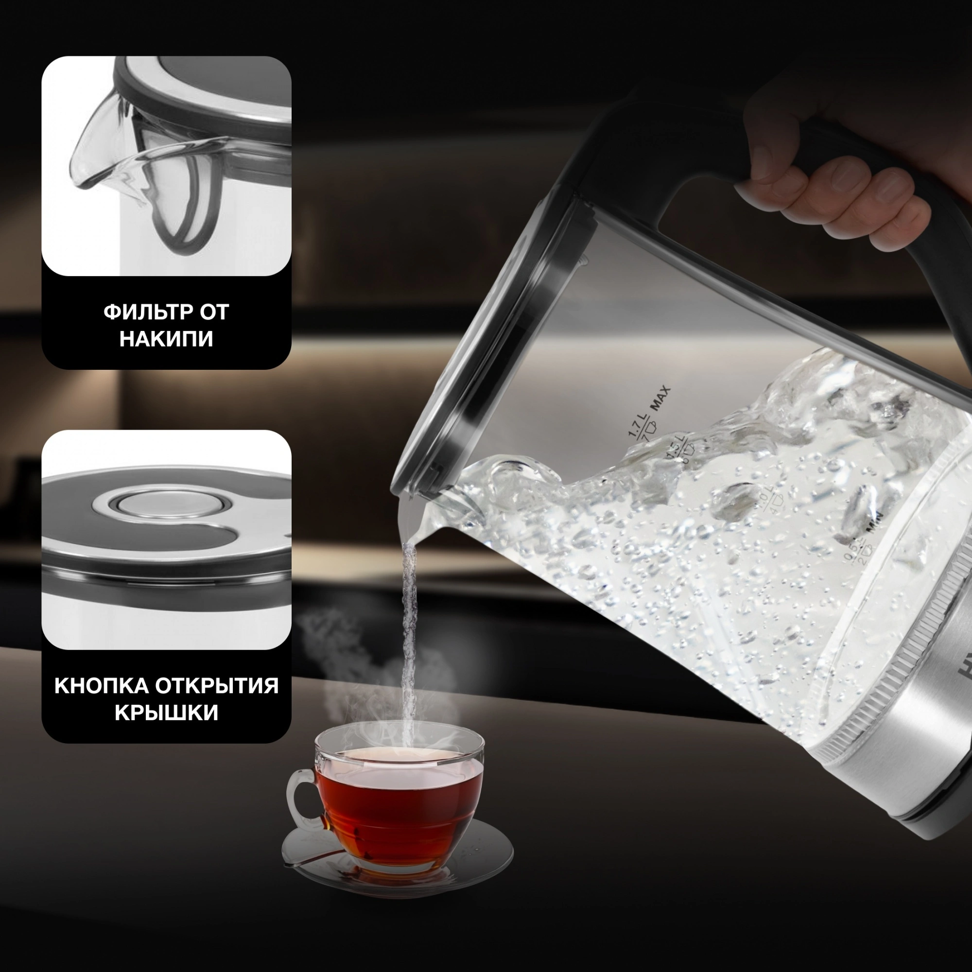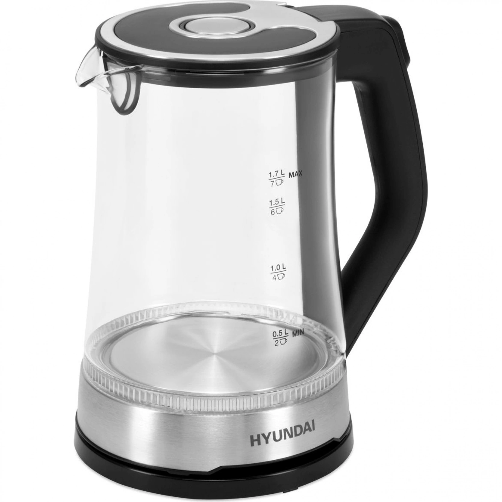 Стеклянный электрический чайник с подсветкой Hyundai HYK-G3401 позволит вскипятить воду для заваривания чая или приготовить до 7 порций горячего напитка. Специальные метки на корпусе позволят точно рассчитать необходимый для этого объем, а благодаря встроенному в крышку фильтру от накипи посторонние включения не окажутся в чашках.