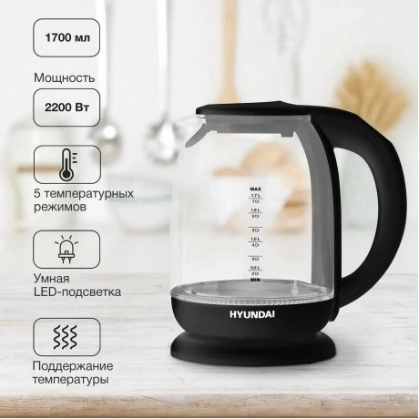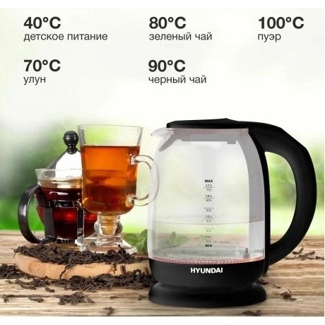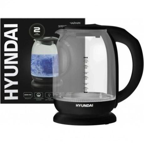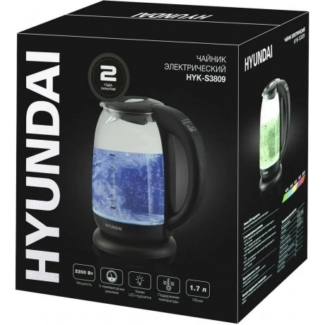 Обеспечит быстрый нагрев воды чайник HYUNDAI HYK-S3809 мощностью 2200 Вт объемом 1.7 л со скрытым нагревательным элементом. Обладает подсветкой воды, цветовая гамма которой меняется в зависимости от режима температуры (всего 5, с регулировкой). Устанавливается на вращающейся на 360 градусов подставке. Оснащен индикаторами включения и уровня воды. Фильтр в носике чайника не допускает попадания накипи в чашки. Предусмотрены функции автоматического отключения, защиты от включения без воды, поддержания температуры. Обеспечивается блокировка крышки во время нагревания и кипения воды. Открыть ее можно нажатием специальной кнопки. Предусмотрены звуковой сигнал при закипании и эффектная подсветка воды.