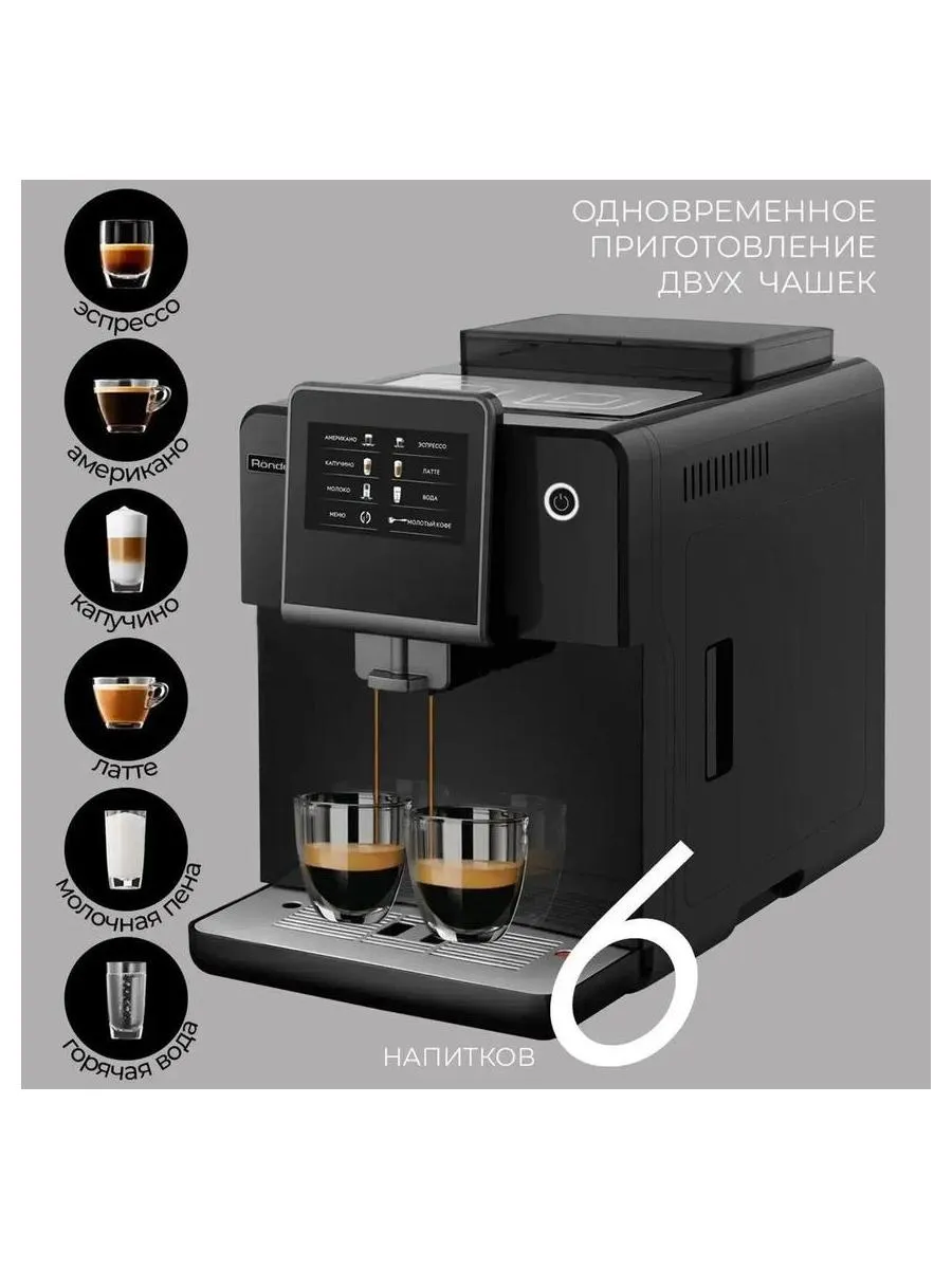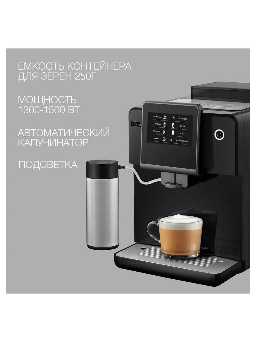 Кофемашина RDE-1110 Автоматическая кофемашина с сенсорным управлением обеспечивает непревзойденный уровень комфорта в приготовлении любимых напитков. Вы будете удивлены, насколько этот процесс может быть легким и завораживающим! Эспрессо и капучино, американо и латте готовятся одним нажатием соответствующей иконки на цветном пятидюймовом TFT-дисплее. Кроме того, кофемашина идеально взобьёт молочную пенку или просто нагреет воду.Качество кофе, приготовленного в приборе, поистине идеальное: помпа итальянской фирмы ARS обеспечивает давление 19 бар для максимальной экстракции зерен любого сорта кофе, поэтому напитки имеют богатый вкус и непревзойденный аромат. Перед приготовлением кофе кружки и чашки можно подогреть на специальной металлической площадке. В процессе приготовления любимого напитка вы можете выбирать не только степень крепости кофе (9–12 г) и его температуру (75°С–95°С), но и его объем (20–250 мл), а также количество добавляемого молока. Чтобы достичь идеального результата в приготовлении капучино и латте, в кофемашине установлен регулятор молочной пены, благодаря которому вы сможете подобрать оптимальный уровень плотности пенки для ваших напитков. Кроме того, в комплекте устройства есть термоконтейнер для молока объемом 415 мл, который сохранит его свежим и охлажденным на несколько часов.