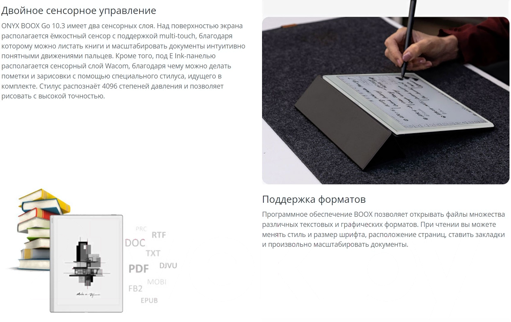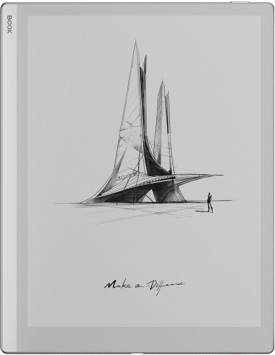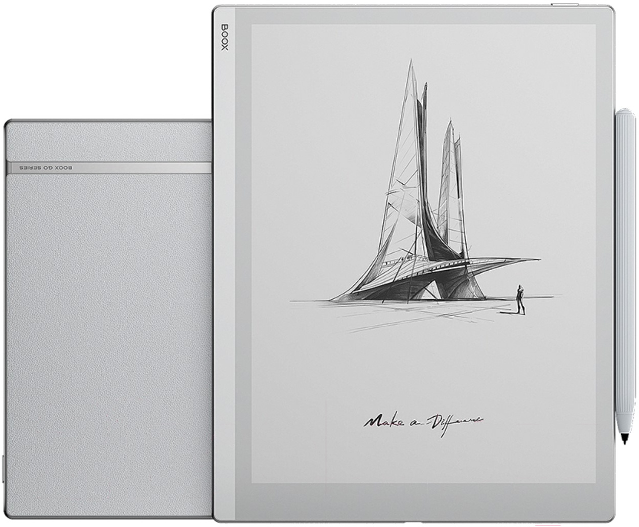 Модель ONYX BOOX Go 10.3 была разработана специально для тех, кому нужен как можно более лёгкий и как можно более тонкий ридер с 10-дюймовым экраном без подсветки, но с двумя тачскринами: ёмкостным и индукционным. Эта читалка вправе похвастать очень элегантным корпусом из металла и композитных материалов, а также весьма богатым функционалом. Чуть ниже мы подробнее расскажем о её достоинствах и особенностях.