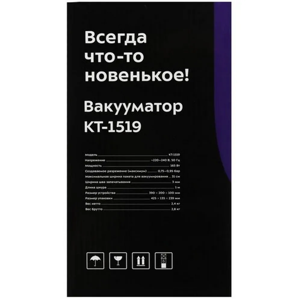 Вакуумный упаковщик Kitfort КТ-1519 - характеристики и описание, фото и цены представлены на карточке товара. Для того чтобы купить товар по цене 7990 руб., вам надо позвонить по телефону 8(495)137-52-98 в Москве, или оформить покупку в личном кабинете.