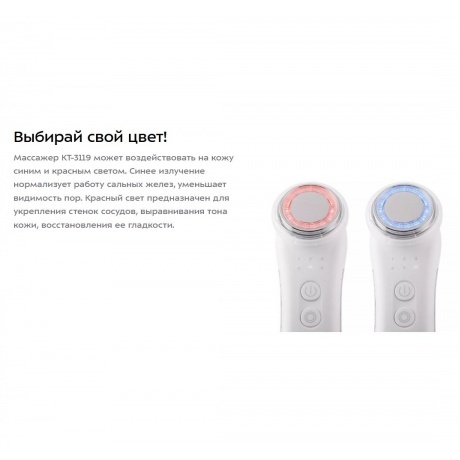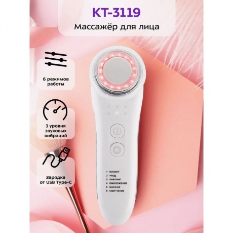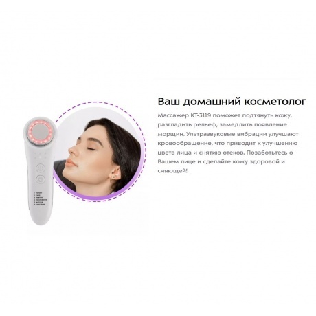 Массажер КТ-3119 поможет подтянуть кожу, разгладить рельеф, замедлить появление морщин. Ультразвуковые вибрации улучшают кровообращение, что приводит к улучшению цвета лица и снятию отеков. Позаботьтесь о Вашем лице и сделайте кожу здоровой и сияющей!