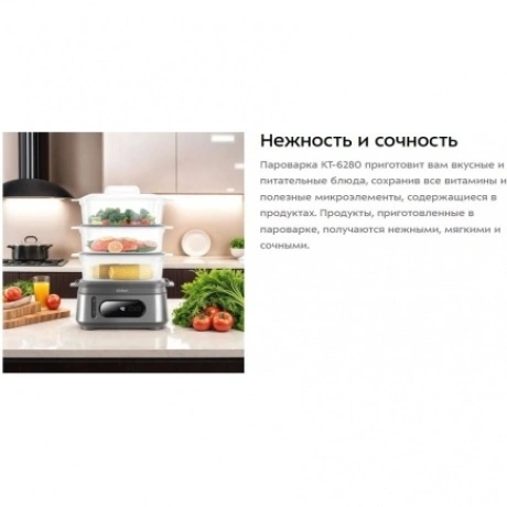 Пароварка КТ-6280 приготовит вам вкусные и питательные блюда, сохранив все витамины и полезные микроэлементы, содержащиеся в продуктах. Продукты, приготовленные в пароварке, получаются нежными, мягкими и сочными.