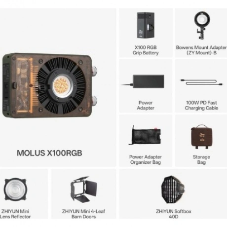 Источник света Zhiyun MOLUS X100 RGB, Сетевой адаптер питания с кабелем, Сумка для сетевого адаптера питания, Краткая инструкция, Рефлектор ZHIYUN Mini Lens Reflector (ZY Mount), Чехол, Кабель USB-C PD для зарядки 100 Вт, Батарейная рукоятка для Zhiyun MOLUS X100 RGB, Софтбокс ZHIYUN Softbox 40D (ZY Mount), Переходник с ZY Mount на байонет Bowens (тип В), Четырехлепестковые шторки, Сумка для хранения и переноски
