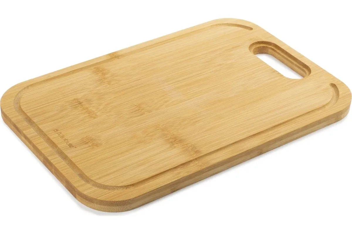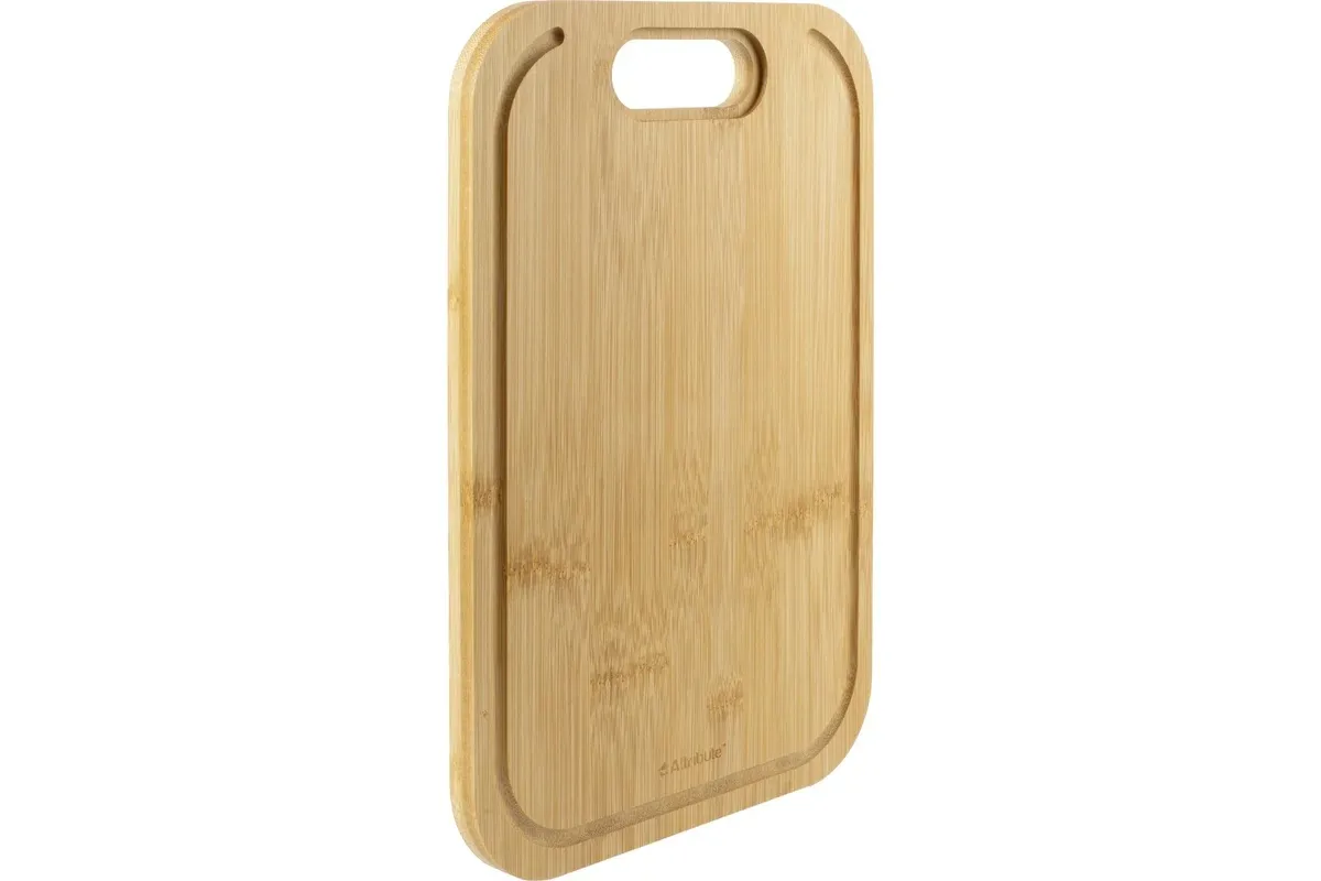Разделочная доска должны быть на каждой современной кухне. Вы можете выбрать подходящий размер такого аксессуара для кухни или приобрести доски разных размеров. Разный размер досок помогает шинковать и резать отдельные группы продуктов, соблюдать гигиену при использовании сырых и вареных продуктов. Разделочная доска из бамбука отлично подходит для нарезки самых разных продуктов. Это могут быть сырое мясо, рыба, овощи, готовая пища. Кроме того, подобные изделия из бамбука можно считать многофункциональными, так как на них можно без опасения ставить горячие кастрюли, сковороды и использовать их в качестве подставки. Стоит отметить, что такой кухонный аксессуар из бамбука совершенно не боится перепада температур. Разделочной доской из бамбука очень удобно пользоваться, она легкая, гладкая, долговечная. Доска может стать украшением интерьера кухни, а не только практичным аксессуаром. Благодаря тому, что это довольно-таки прочный и износостойкий материал, такая доска длительное время не утратит свой первоначальный вид. Бамбуковая посуда прекрасно подойдет для подачи различных блюд и в качестве сервировочной сырной доски для вина, закусок, пиццы, канапе, суши и роллов, мяса, сыра, стейка, шашлыка, фруктов или овощей, а также может быть использована в качестве подставки для горячего, столика-подноса для завтрака в постель. Поверхность нашего кухонного аксессуара оснащена неглубоким желобком по краям.