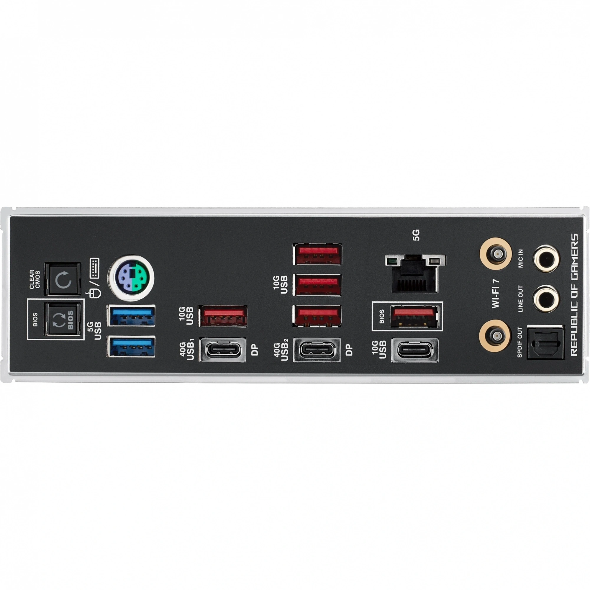 Задняя панель Asus ROG CROSSHAIR X870E APEX оснащена самым современным набором интерфейсов для любых задач. Пользователю доступны порты USB4 и множество высокоскоростных USB 3.2 Gen 2, включая Type-C, а за сетевые возможности отвечает быстрый 5GbE или 2.5GbE Ethernet-контроллер и встроенный модуль Wi-Fi 7 с Bluetooth. За качественный звук отвечает фирменный кодек SupremeFX с высококачественными компонентами, а для энтузиастов предусмотрен целый арсенал оверклокерских инструментов: POST-индикатор, кнопки Start и Reset, точки замера напряжений и расширенные опции в UEFI BIOS.