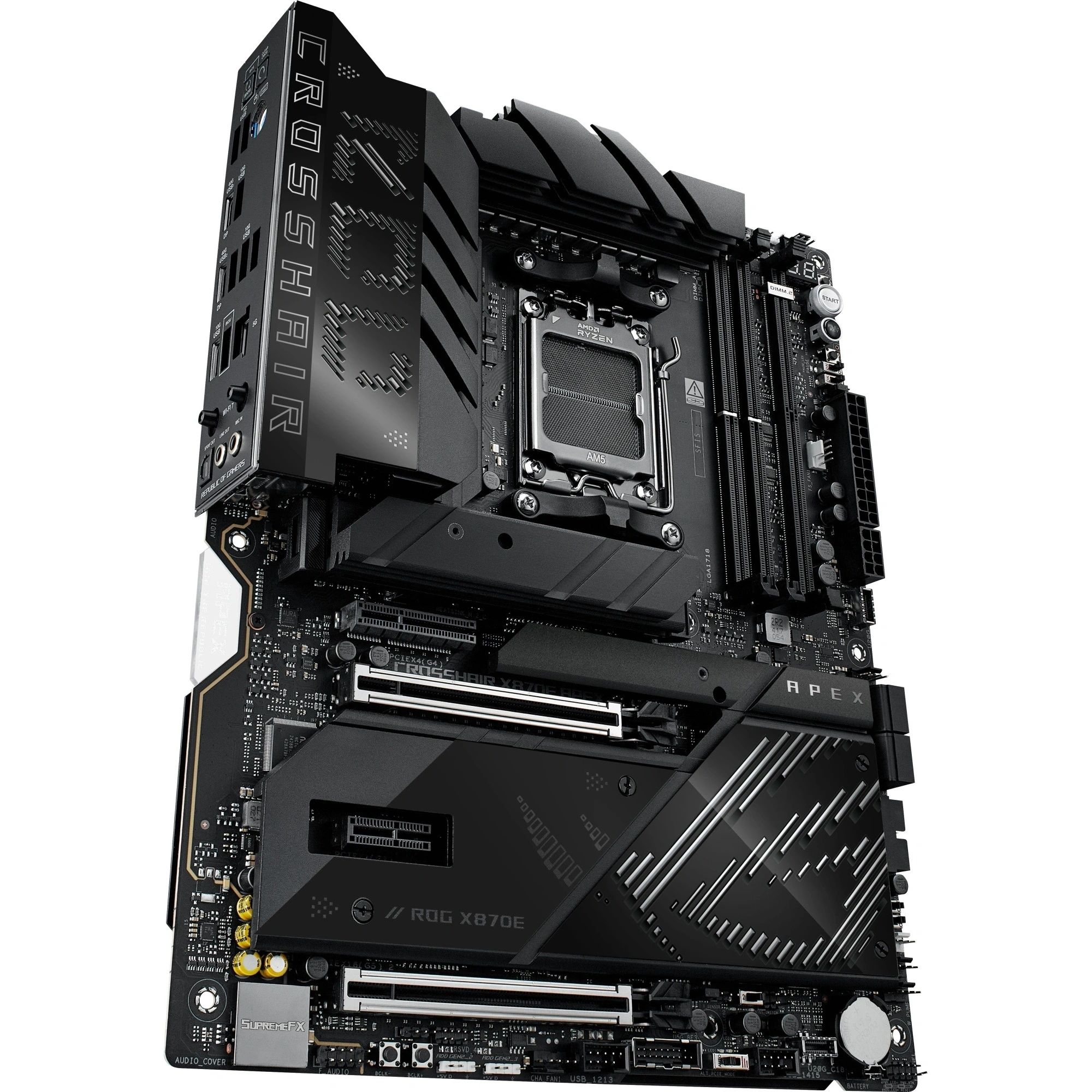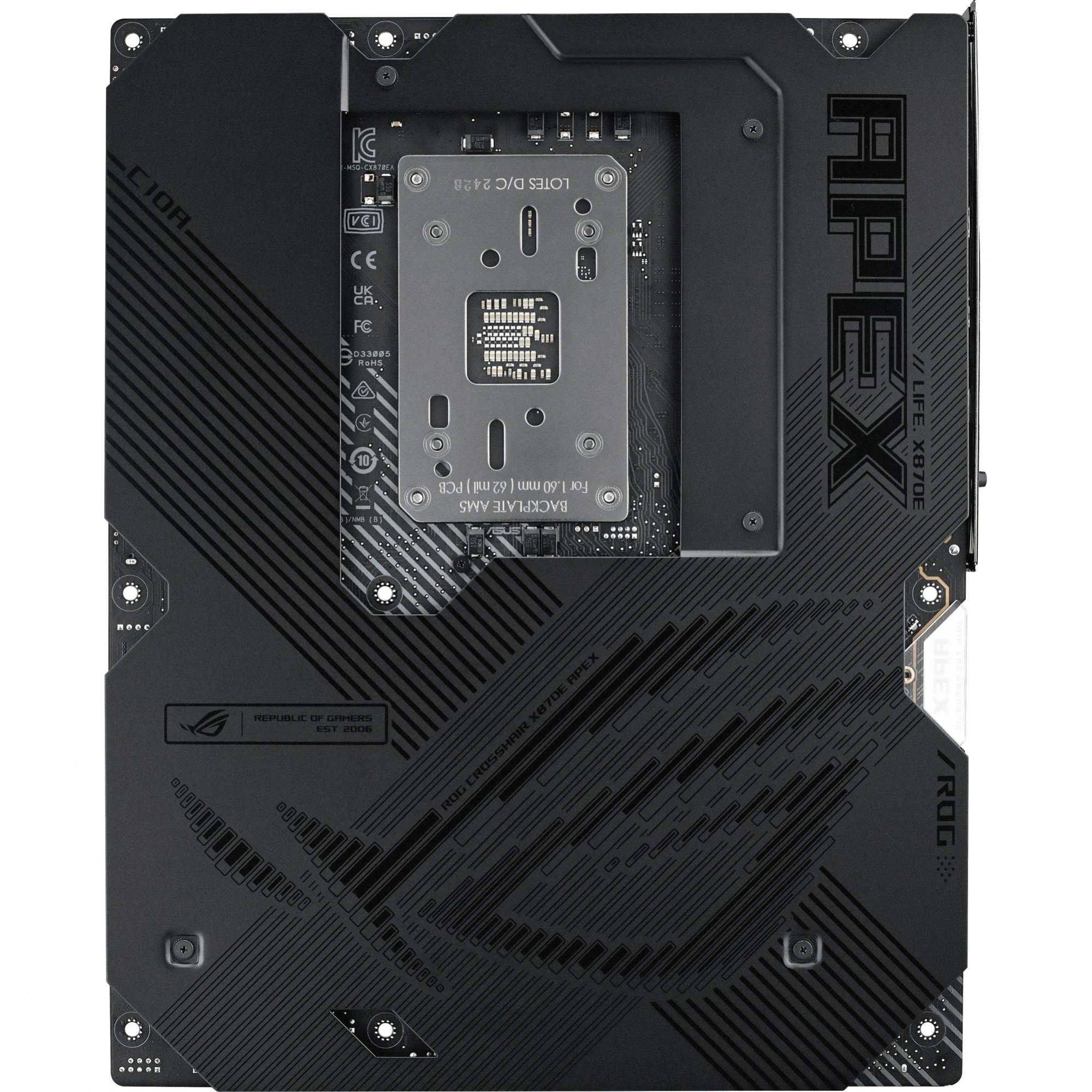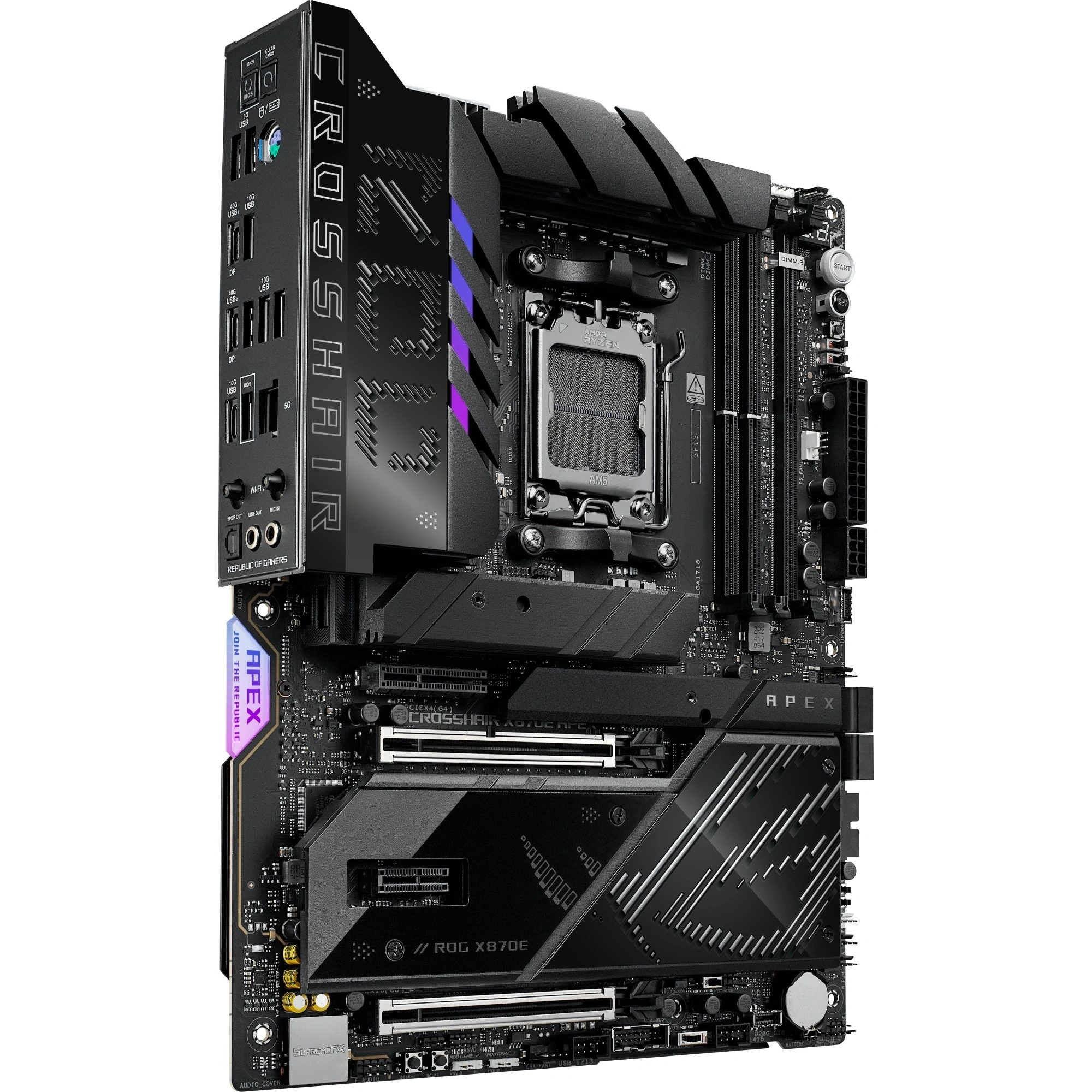 В основе платы лежит новейший флагманский чипсет AMD X870E, разработанный для сокета AM5 и раскрывающий полный потенциал процессоров Ryzen 9000-й серии. Чипсет с индексом ""E"" (Extreme) гарантирует максимально широкую поддержку интерфейса PCIe 5.0 как для видеокарты, так и для сверхбыстрых NVMe-накопителей. Выполненная в стандартном форм-факторе ATX, ROG CROSSHAIR X870E APEX требует просторного корпуса, который обеспечит достаточно места для установки производительных систем охлаждения и удобного кабель-менеджмента, что критически важно для высокопроизводительных сборок.