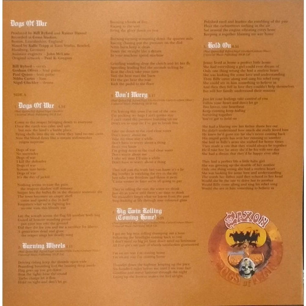 Благодаря альбомам начала 90-х, таким как Solid Ball of Rock и Forever Free Saxon убедили многих скептиков, что они всё ещё могут предложить много качественного хэви-метала. После трёхлетнего перерыва в записях группа вернулась к славе с мощно звучащим Dogs of War . После своего громоподобного заглавного трека Dogs of War представил множество невероятно запоминающихся и самобытных номеров, включая Big Twin Rolling (Coming Home) The Great White Buffalo и Demolition Alley . Это был также последний альбом с давним гитаристом Грэмом Оливером в качестве участника классического состава — он покинул группу вскоре после выхода альбома.