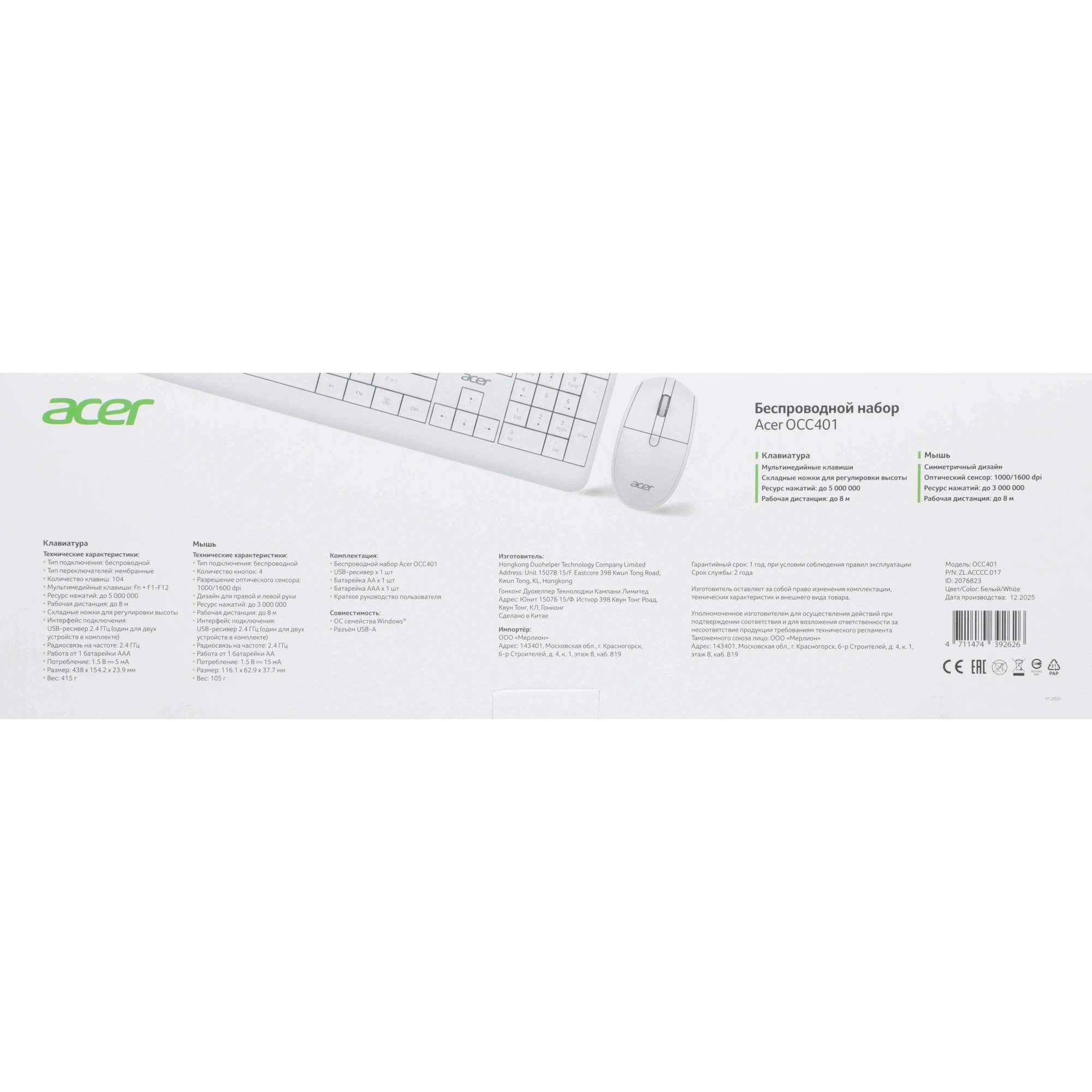 Клавиатура + мышь Acer OCC401 белый (ZL.ACCCC.017) в Москве